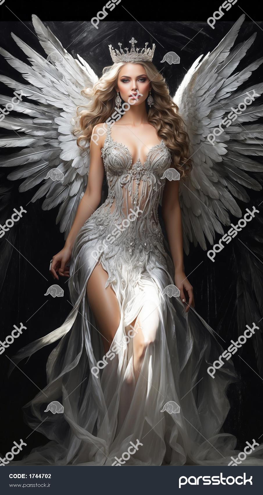 والپیپر عمودی فرشته زیبا با بال‌های سفید و سیاه در هاله‌ای از نور درام