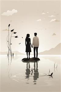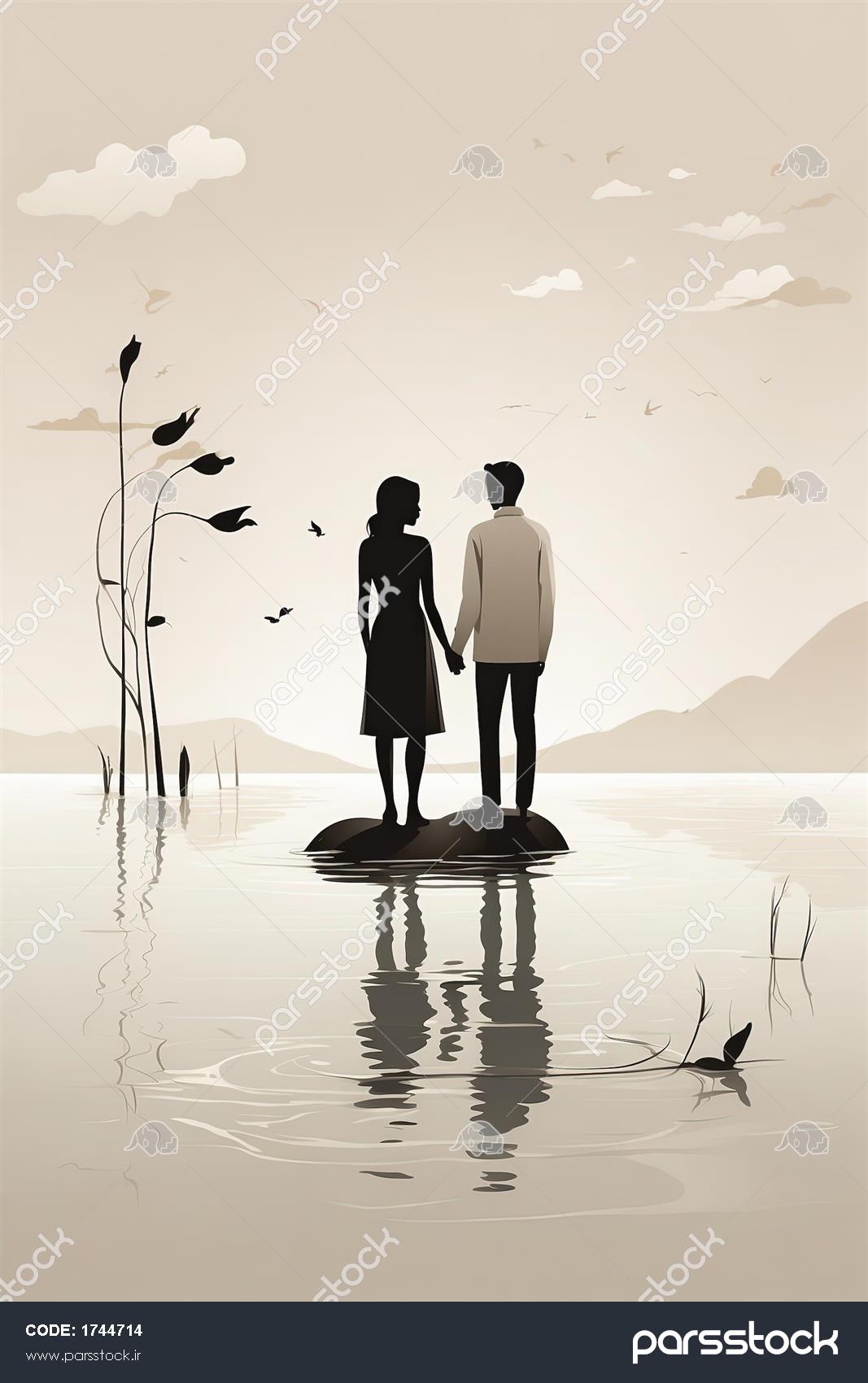 طرح دکوراتیو زوج عاشق (سیلوئت) ایستاده روی صخره در دریاچه مه‌آلود