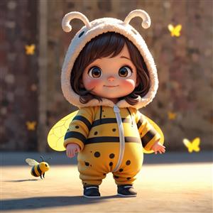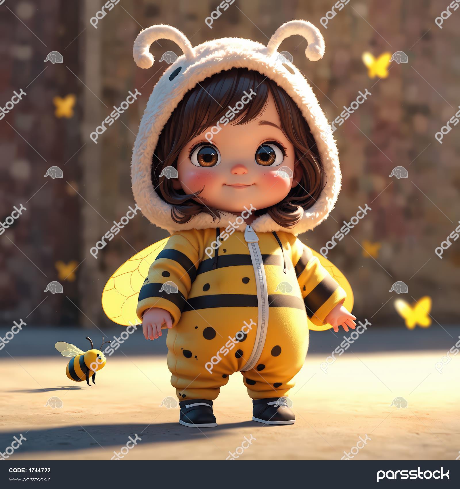 طرح دختر کارتونی زنبوری با خال‌های مشکی و کلاه کرکی در فضای باز