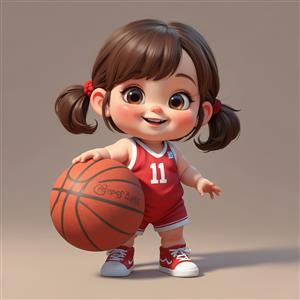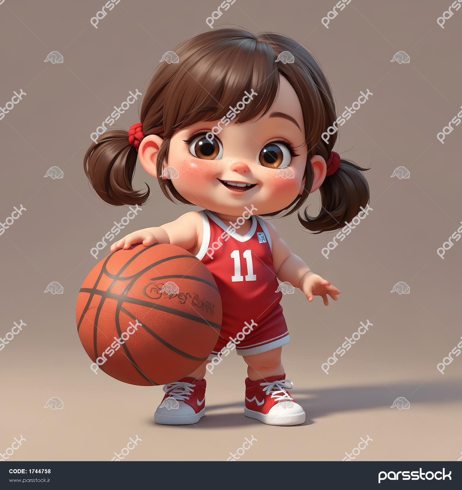 کاراکتر کودک کارتونی سه بعدی با لباس ورزشی قرمز و توپ بسکتبال، تصویر گرافیکی با کیفیت بالا
