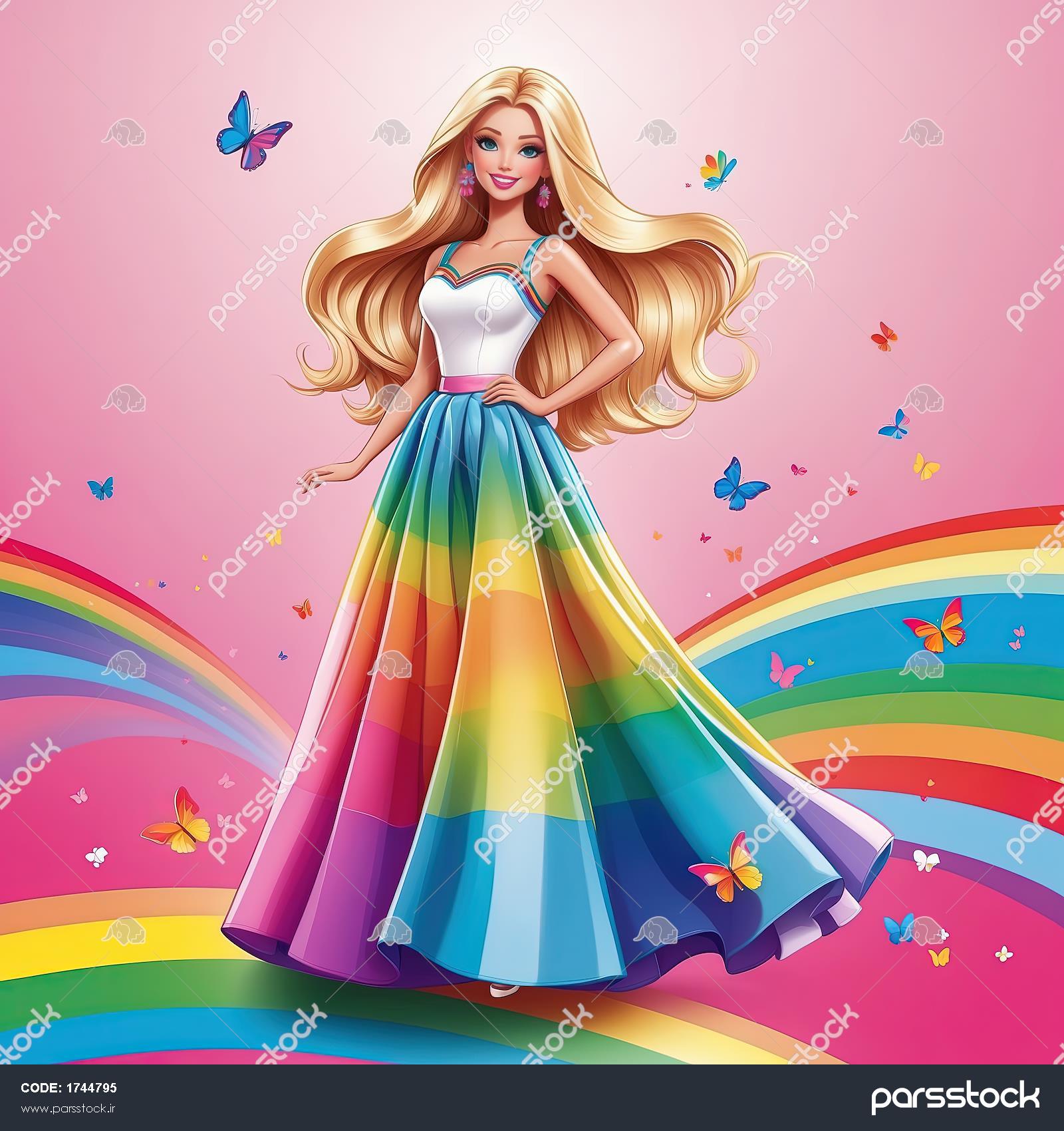 پوستر باربی با موهای بلند و لباس پرنسسی دامن حجیم رنگینکمان طرح باربی با دامن دنباله دار رنگینکمان برای چاپ روی بوم باربی با پیراهن بلند طرحدار و پاپیون صورتی روی مو باربی با شنل پرنسسی رنگارنگ و لباس بلند پر زرق و برق باربی با تاج شاهزاده و لباس بلند رنگارنگ و شال گردن باربی با روسری طرحدار و لباس بلند رنگینکمانی در پسزمینه صورتی باربی با شال رنگینکمان و لباس شب بلند برای چاپ دکوراتیو طرح باربی پری پروانه با بالهای رنگینکمانی و لباس مجلسی باربی درخشان با پیراهن بلند رنگین کمان و پرواز پروانهها باربی با لباس بلند رنگینکمانی و موهای طلایی برای تابلو نمایش همه