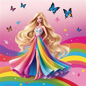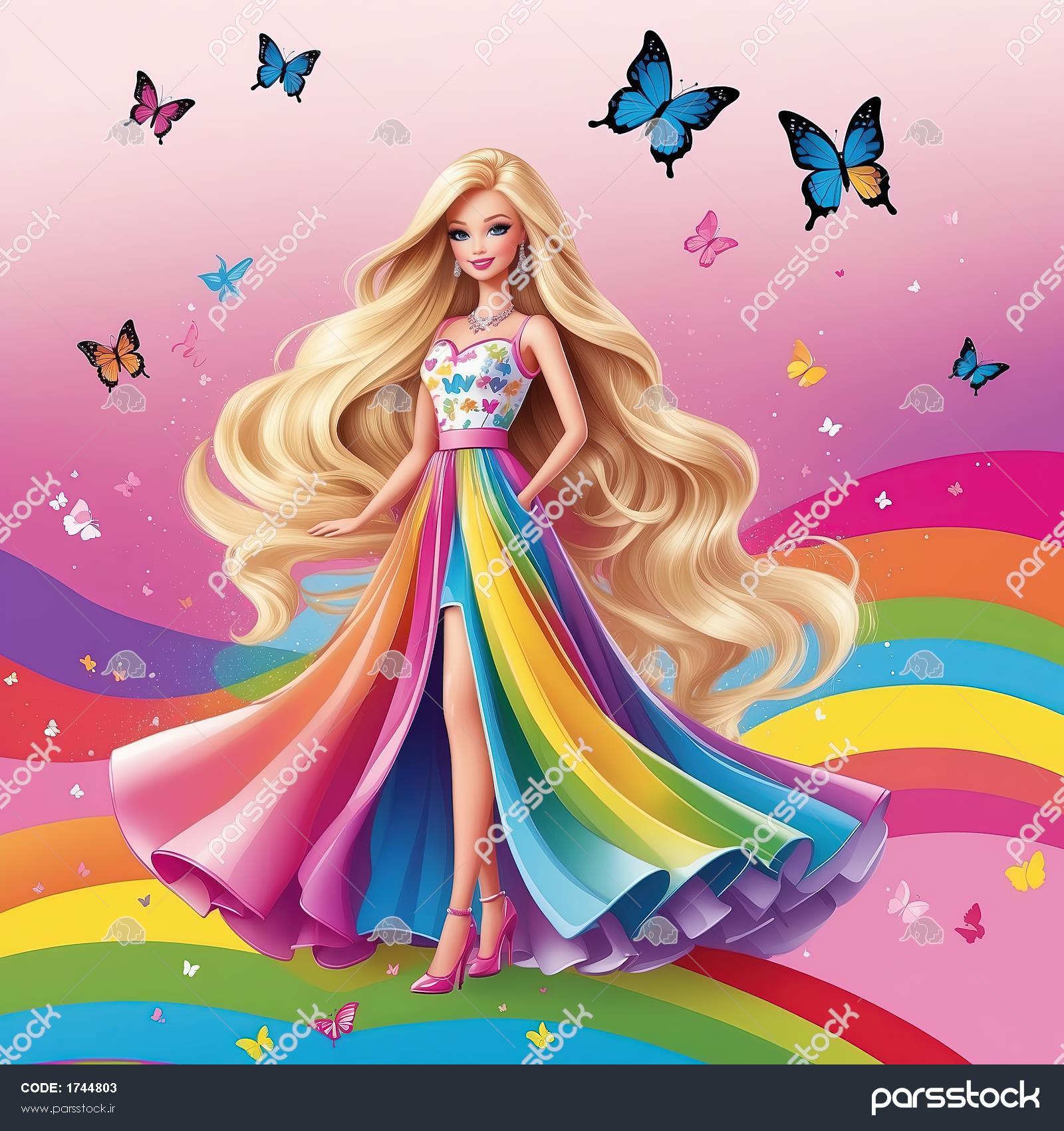 باربی با لباس دامن بلند چاک‌دار رنگین‌کمانی و پروانه‌های آبی