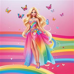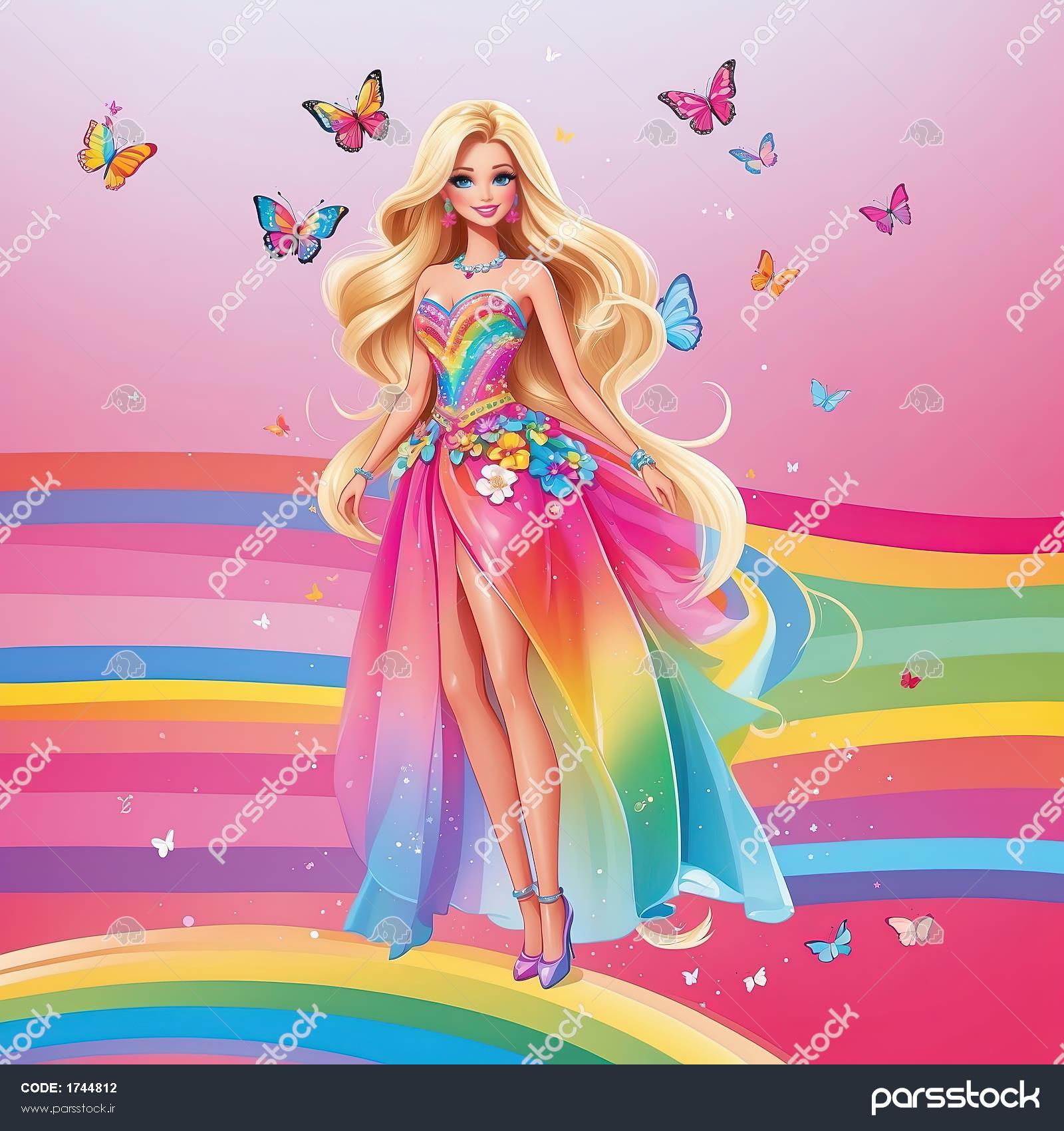 باربی لباس مجلسی شیک رنگارنگ در پس زمینه صورتی و رنگین کمان