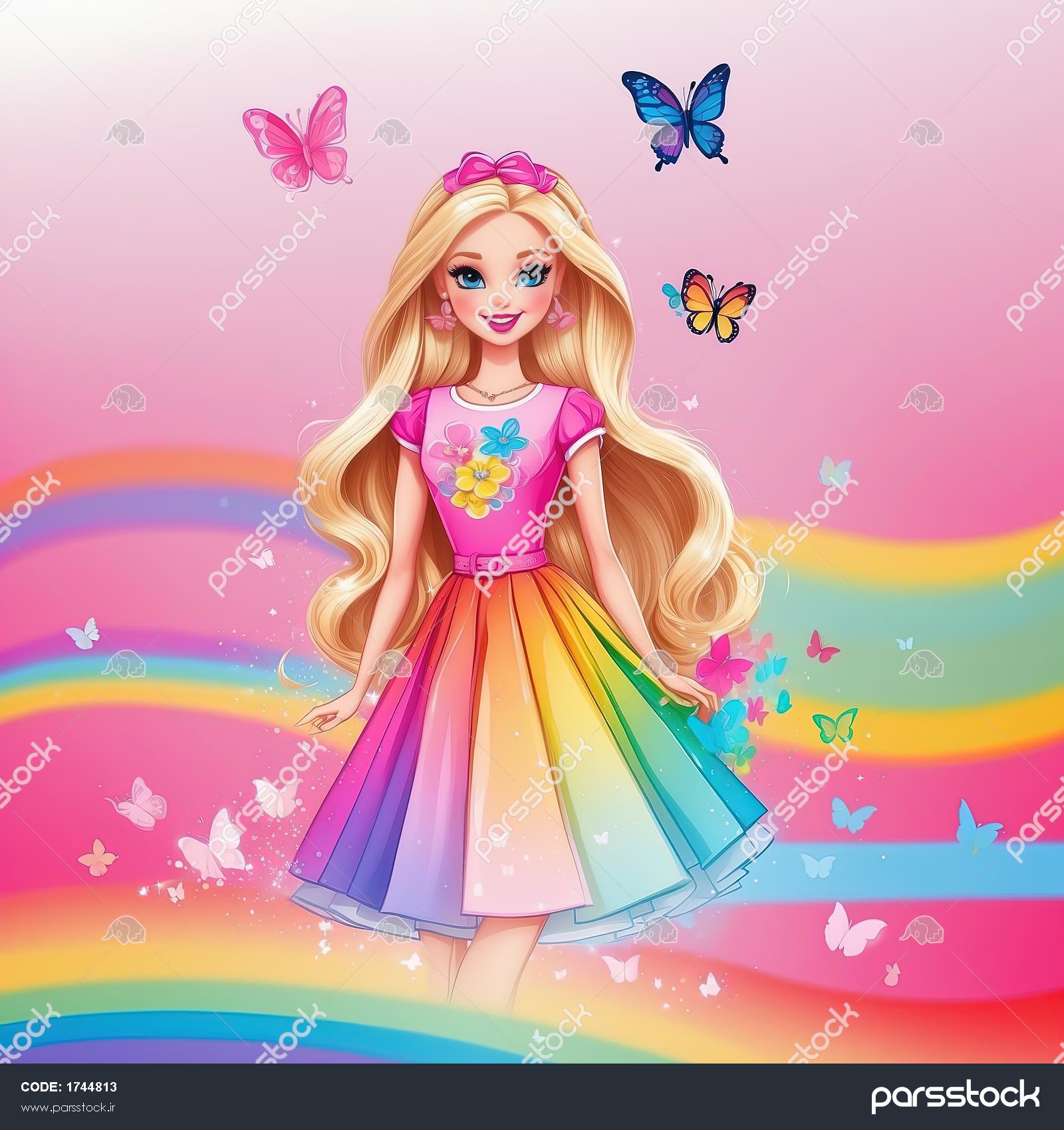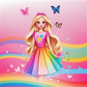 باربی دخترانه با پیراهن کوتاه رنگین کمان و پس زمینه صورتی