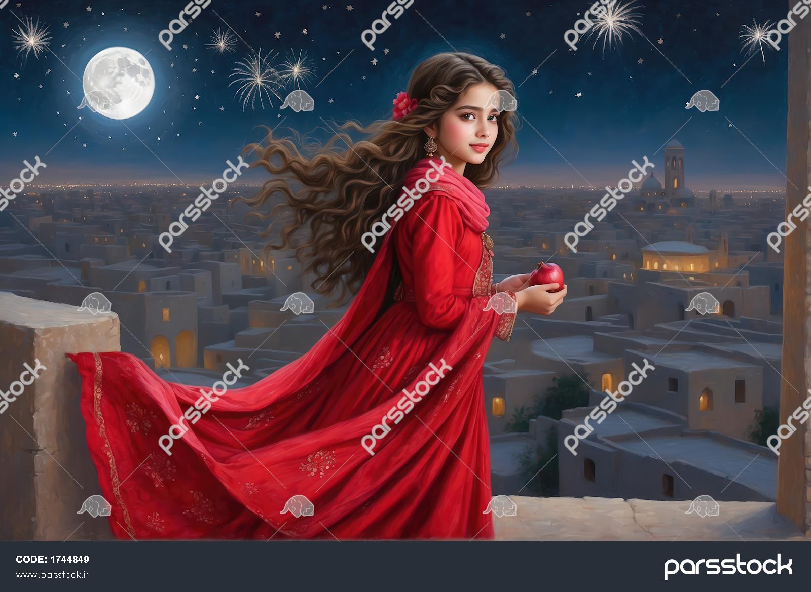 پرتره دختر با لباس سرخ و انارهای در دست زیر ماه هلالی، تم هنری دختر ایرانی در لباس شیک آبی و قرمز با انار بزرگ زیر هلال ماه دختر زیبا در لباس قرمز سنتی بر بالکن با منظره شب شهر و هلال ماه دختر با لباس قرمز سنتی و انار زیر ماه بزرگ سرخ، منظره کوهستانی شب دختر جذاب با پیراهن قرمز و آبی در تراس شهر قدیمی زیر نور ماه پرتره دختر معصوم با انار و لباس سفید و شال قرمز زیر ماه کامل تصویر هنری دختر زیبا با لباس قرمز و شال بادی زیر ماه و ستارهها پرتره دختر دلربا با شال قرمز و انار در دست زیر نور ماه شب یلدا پرتره دختر رویایی در شال قرمز با انار در دست زیر هلال ماه و ستارهها عکس باکیفیت دختر زیبای شب یلدا با موهای باز و ماه قرمز مناسب چاپ پوستر دکوراتیو نمایش همه