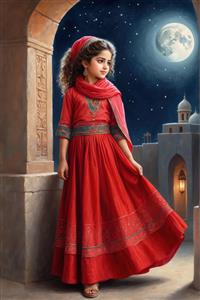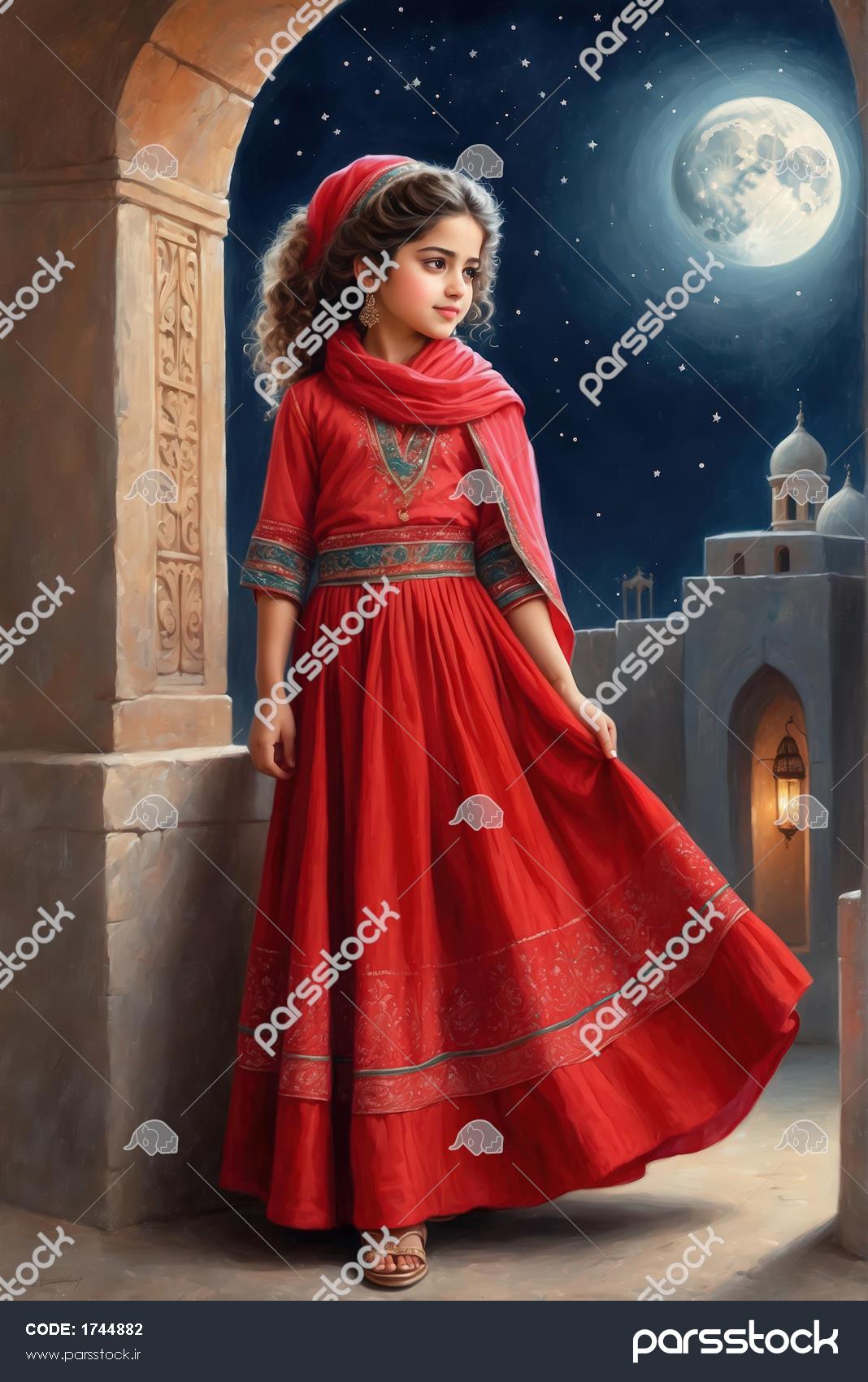 دختر ظریف با پیراهن قرمز سنتی زیر طاق و معماری قدیمی در شب