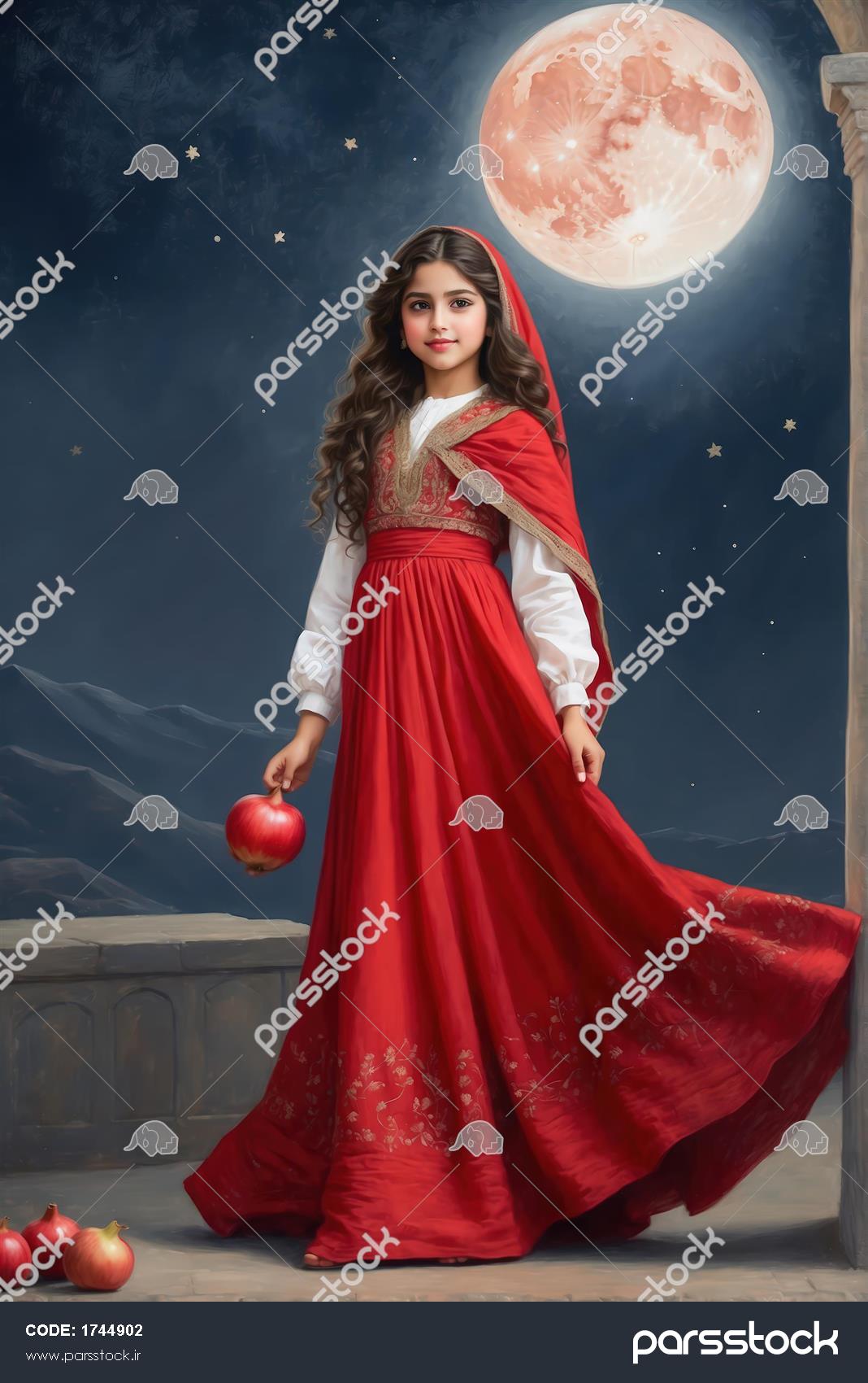 دختری با لباس یلدایی در کنار ماه خونین بزرگ و هندوانه، منظره شب دختری با شال قرمز و لباس فیروزهای، انار در دست، ماه کامل بزرگ دختر ایرانی در لباس شیک آبی و قرمز با انار بزرگ زیر هلال ماه الهه نور با بالهای بزرگ و لباس رقصنده در آسمان شب دختر شاد با لباس سنتی سرخ و انار در شب با ماه هلالی، تم یلدا و ایران ملکه پریان با لباس شب قرمز کار شده با طلا و بالهای پروانه بزرگ دختر کوچک کارتونی با لباس سبز طرح هندوانه و یک برش بزرگ میوه دختر با لباس یلدایی در بالکن و فانوس با ماه کامل، فضای سنتی شب فرشته سیاه و زرین: پرتره زن بلوند با تاج گل قرمز و بالهای بزرگ طلایی در لباس مشکی دختر زیبا در لباس قرمز سنتی بر بالکن با منظره شب شهر و هلال ماه مشاهده همه
