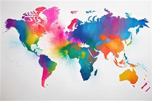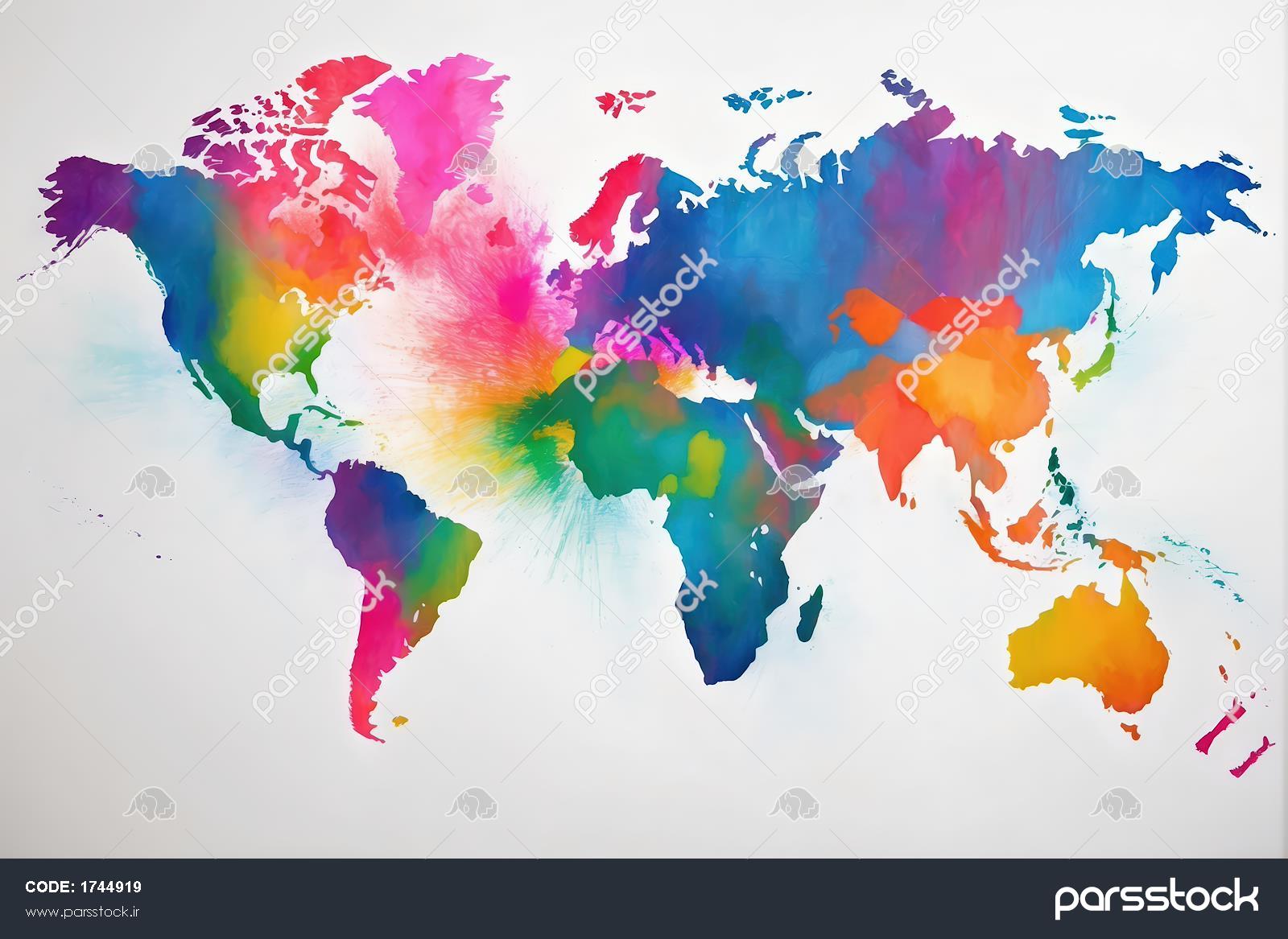 نقشه جهان انفجار رنگ بر زمینه سفید، طرح اسپری آبرنگی انتزاعی