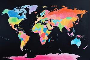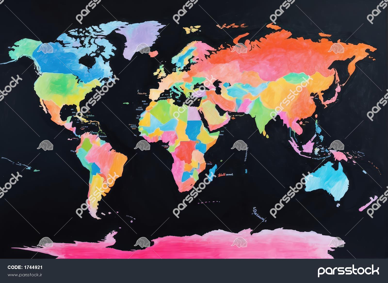 نقشه جهان با رنگ‌های متنوع و بافت آبرنگی بر زمینه مشکی، طرح شاد