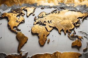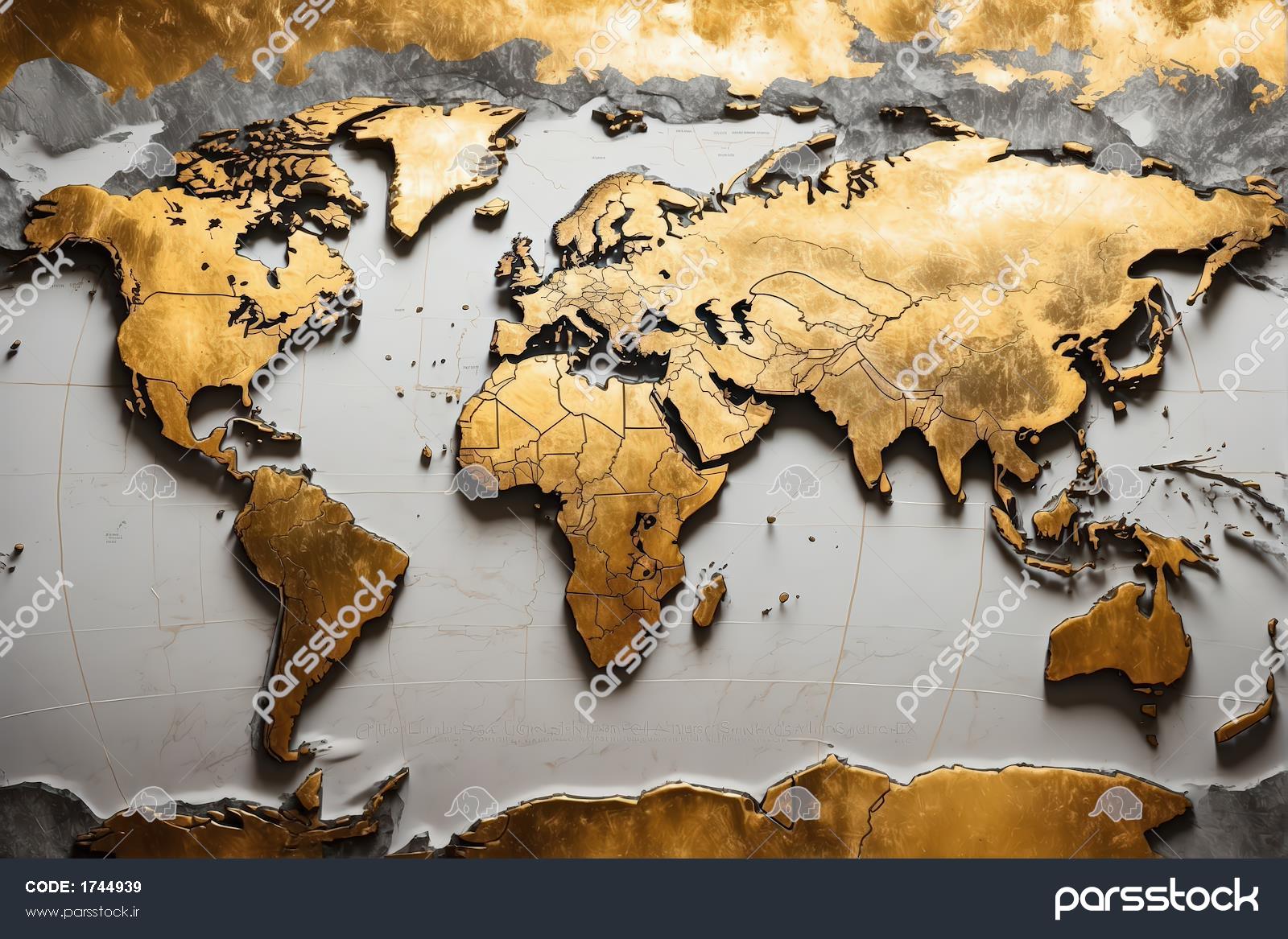 نقشه جهان طلایی با خطوط سیاسی روی بافت گچ‌کاری (نقشه دکوراتیو با مرزبندی‌های جزئی و بافت مجسمه‌سازی شده، لوکس)