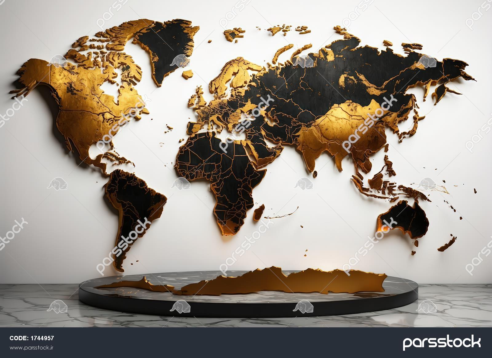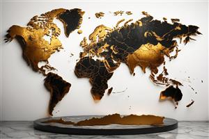 نقشه جهان سه‌بعدی طلایی و مشکی با پلتفرم نمایش (تصویر مینیمال و لوکس نقشه روی دیوار سفید و سکوی مرمری)