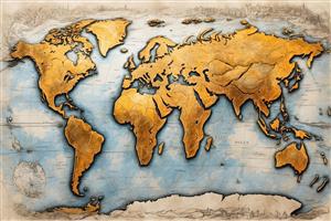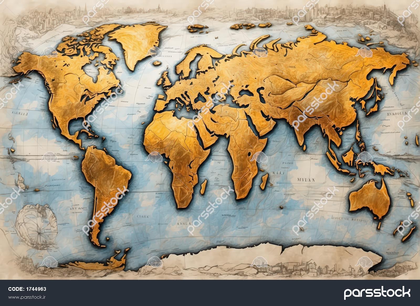 نقشه جهان قدیمی طلایی با مرزهای برجسته روی کاغذ آبی (تصویر دکوراتیو نقشه جهان، بافت قدیمی و سبک آبرنگ)