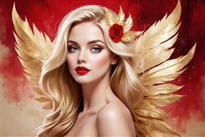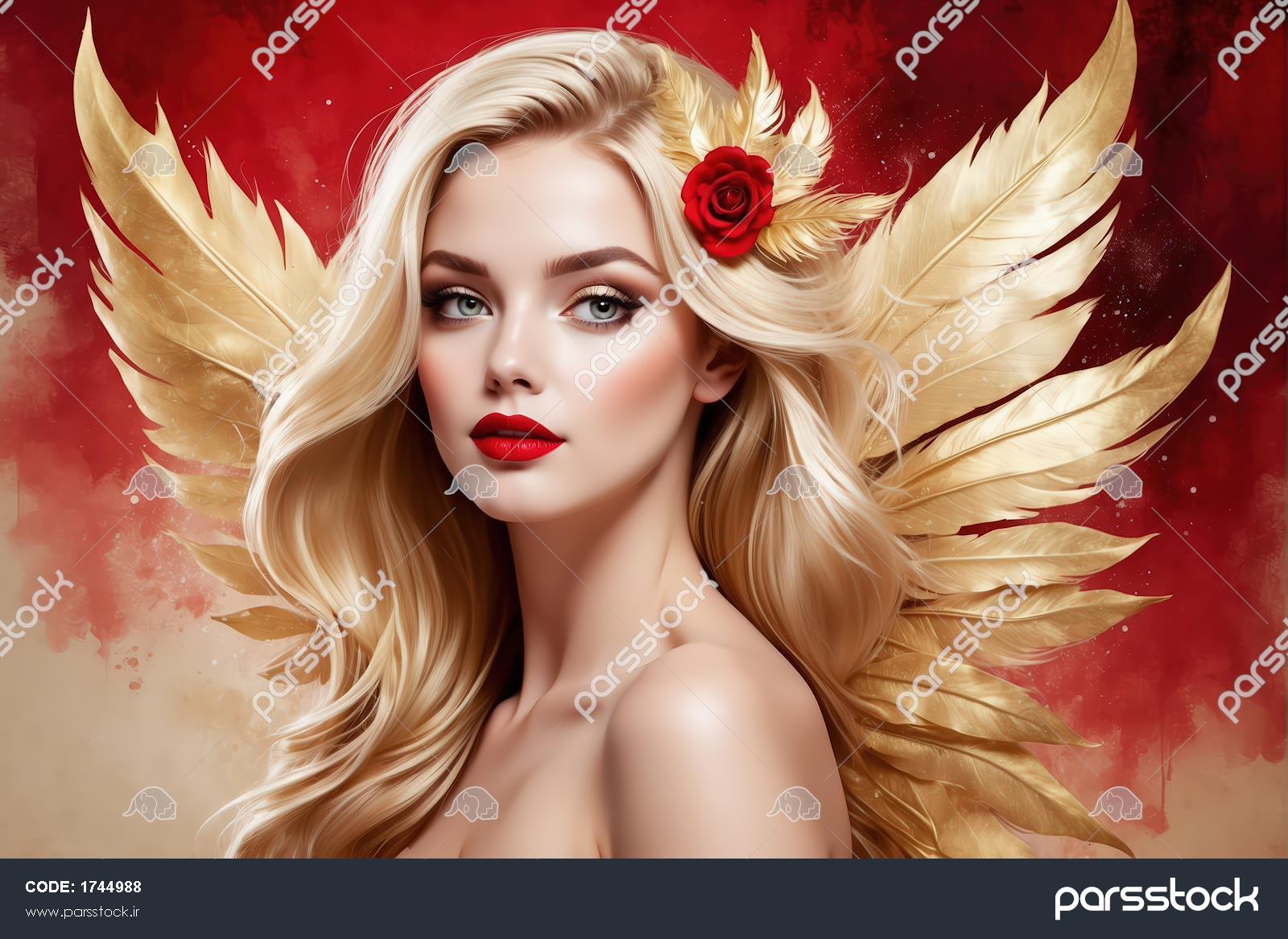 فرشته طلایی و سرخ: زن بلوند با بال‌های زرین و گل رز قرمز روی پس‌زمینه آبرنگی