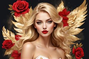 الهه شب با موهای بلوند: پرتره زن با بال‌های طلایی، گل‌های رز قرمز بر پس‌زمینه تیره
