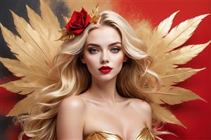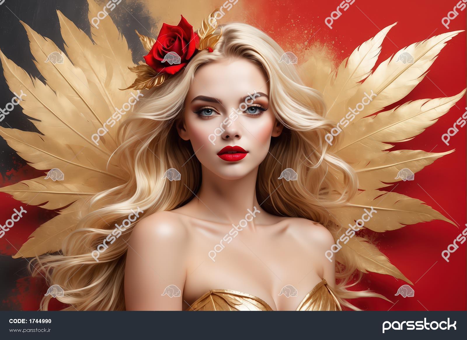 ملکه زرین و سرخ: زن بلوند با بال‌های برگ طلایی بزرگ و لباس طلایی در پس‌زمینه دو رنگ