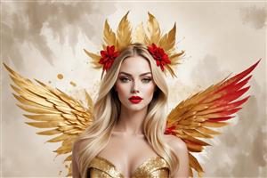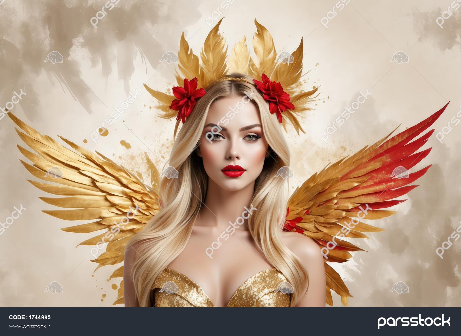 فرشته طلایی با بال‌های آتشین: زن بلوند با بال طلایی و نوک قرمز، تاج پَر و لباس طلایی