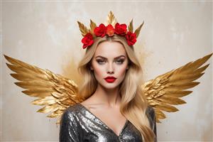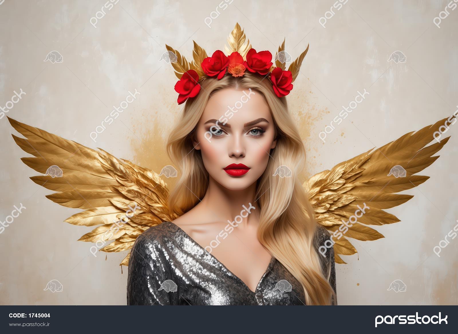 الهه طبیعت طلایی: پرتره زن با بال و تاج برگ طلایی و لباس سبز زمردی با نمای نیمرخ فرشته مد: پرتره مدل با بالهای طلایی، تاج برگ زیتون طلایی و لباس دکلته مشکی فرشته زرین در نور آفتاب: پرتره زن با بالهای طلایی، تاج برگ و لباس طلایی با نگاه رو به بالا پوستر فرشته سیاه: زن بلوند با بال طلایی، تاج پَر و لباس پر مشکی در پسزمینه آبرنگی پرتره الهه طبیعت با تاج برگ طلایی و پرهای درخشان (تصویر زن با موی قهوهای، لباس مشکی و جواهرات طلایی) مرلین مونرو عروس با لباس سفید و طلایی و تاج گل رز در نور ماه سرخ فرشته با بالهای طلایی و گل صورتی در مو، لباس صورتی و تاج مدل زن با لباس برگ سبز و تاج طلایی با بال؛ تابلوی الهام گرفته از طبیعت ملکه زرین و سرخ: زن بلوند با بالهای برگ طلایی بزرگ و لباس طلایی در پسزمینه دو رنگ پرتره دختر با موی مواج و لباس طرحدار، جواهرات طلایی و تاج گل، پسزمینه دریا و آسمان آبی، تم مسافرتی فانتزی نمایش همه