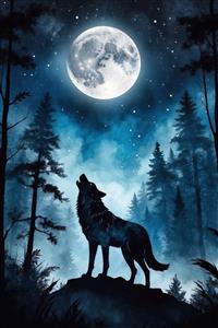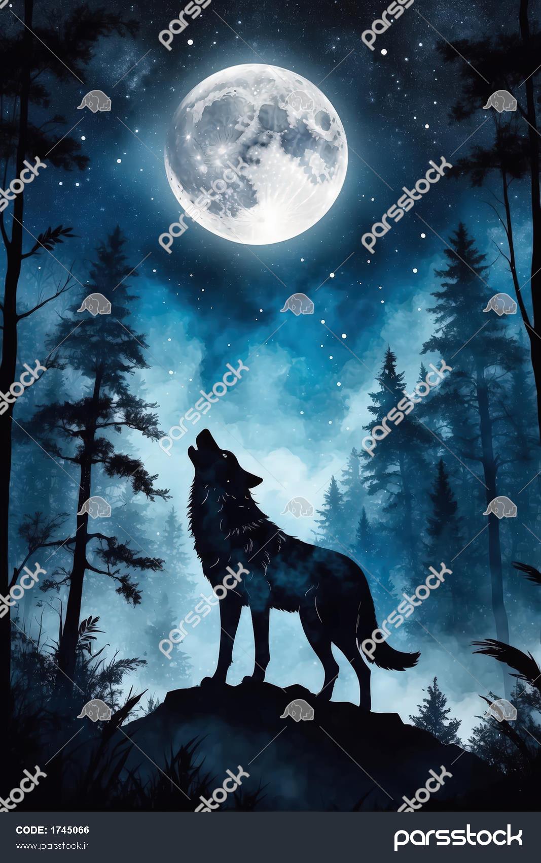 نقاشی آبرنگی گرگ روی صخره با پس‌زمینه درختان کاج و آسمان پر ستاره