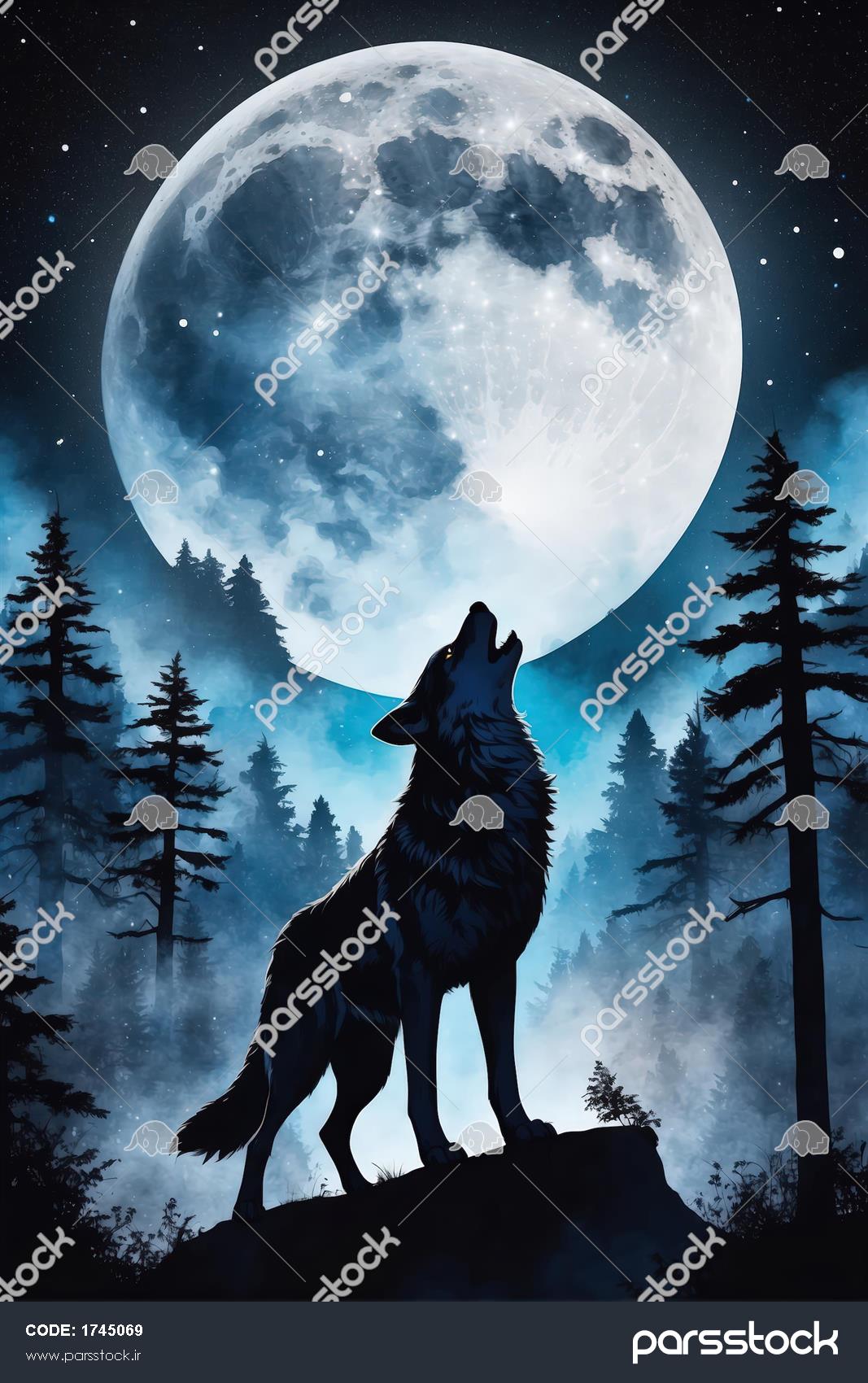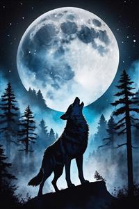 نقاشی باکیفیت گرگ در حال زوزه زدن در جنگل تاریک زیر ماه عظیم (مناسب چاپ پوستر)