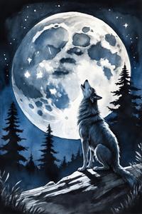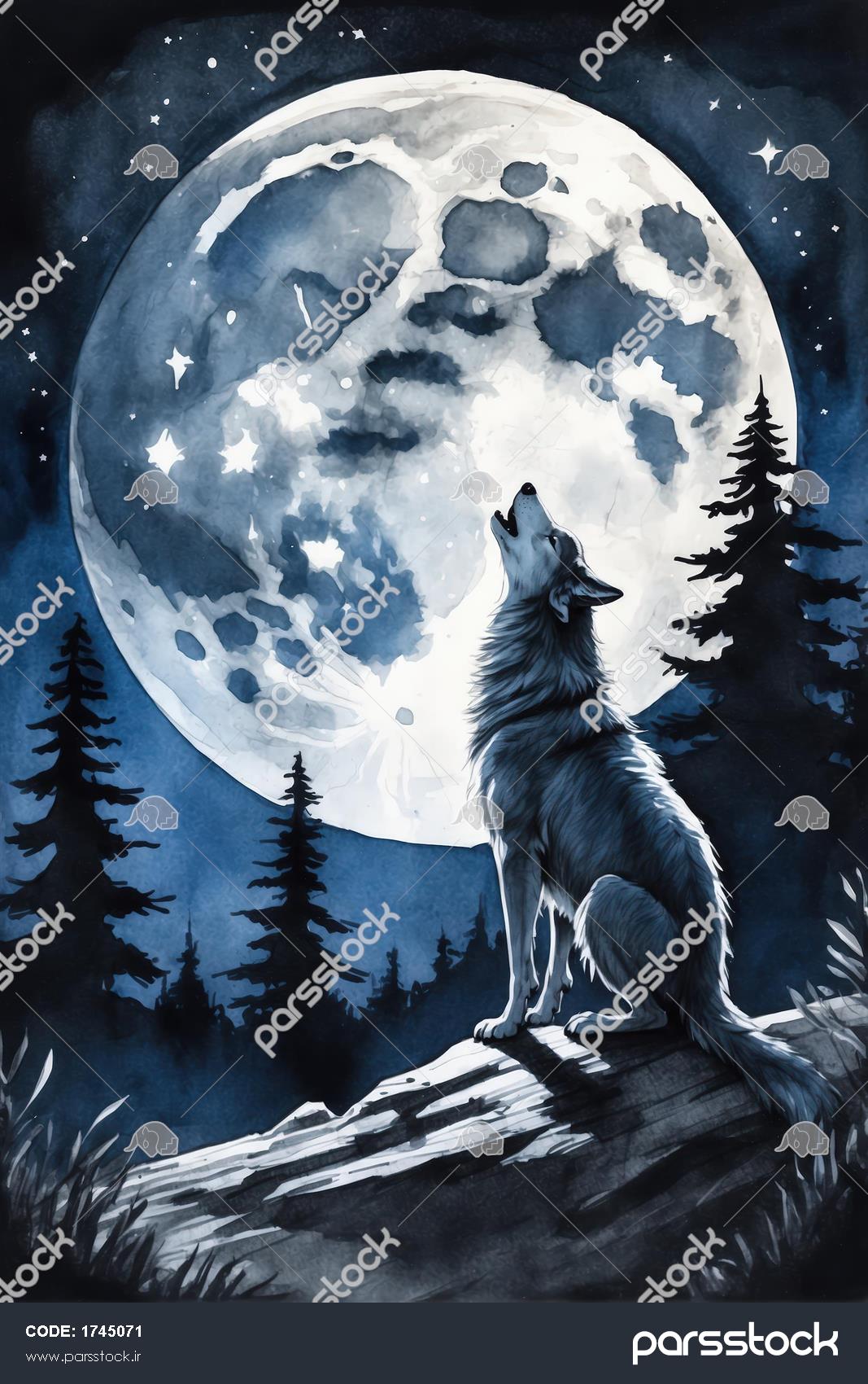 گرگ زوزه‌کش بر روی تنه درخت افتاده در مقابل ماه کامل درخشان (نقاشی عمودی)