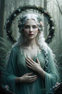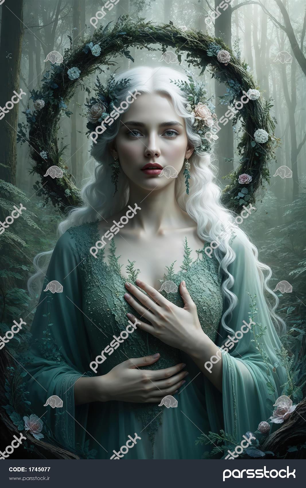 الهه جنگل با لباس فیروزه‌ای و هاله سبزرنگ در فضای مه‌آلود (نقاشی هنری)
