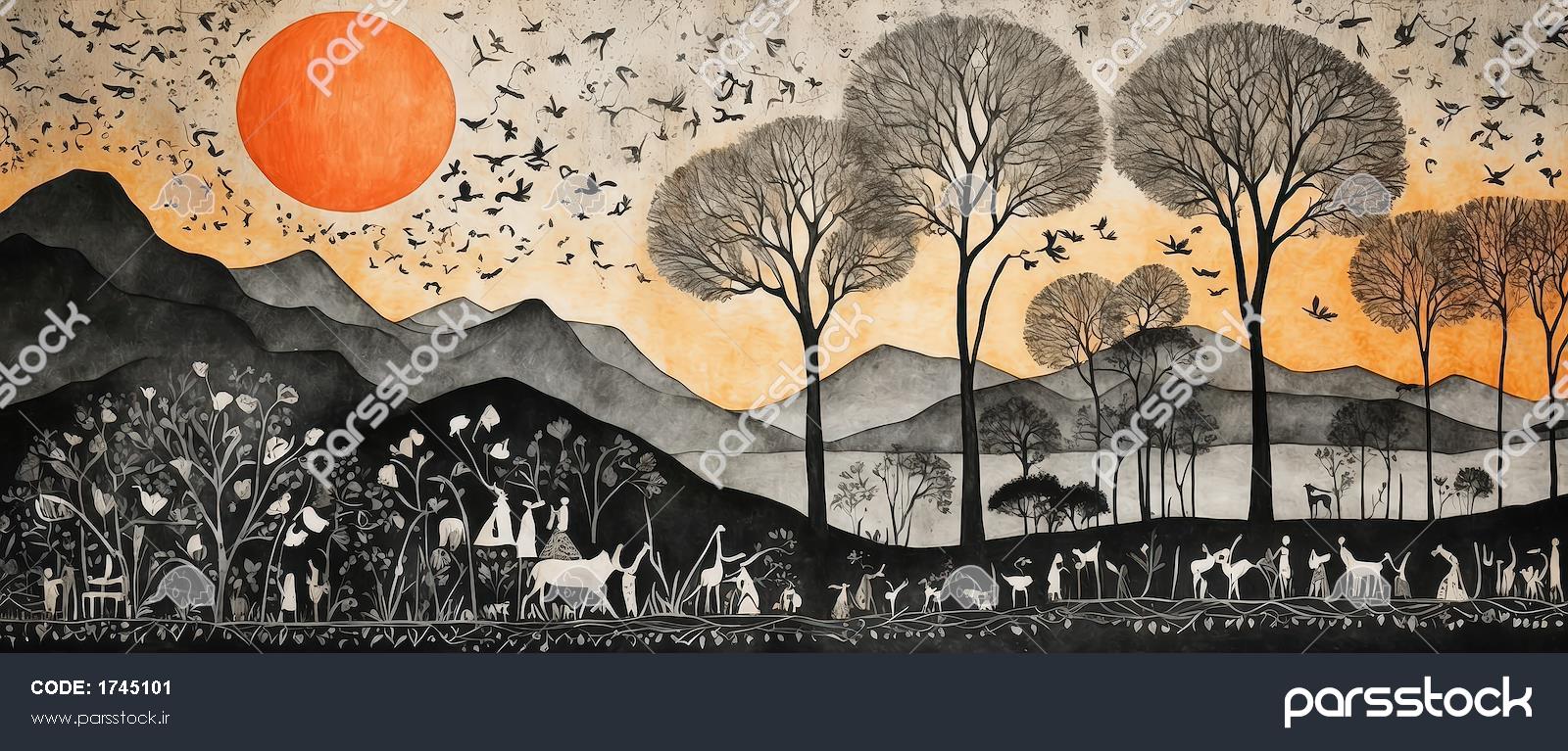 زن در مسیر کنار دریاچه در غروب پاییزی، نقاشی منظره طبیعت با درختان و کوهستان، تصویرسازی غروب در جنگل نقاشی انتزاعی غروب در تپهها با پرندگان و گلهای سفید (طرح پوستر با جزئیات مینیاتوری) منظره عریض کوهستان با دریاچه و طلوع/غروب آفتاب طلایی و قرمز، طرح آبستره نقاشی انتزاعی از کوهستان و رودخانه سنگی با درختان و رنگهای نارنجی و قهوهای تیره نقاشی گله گوزنها در فضای غار مانند با درختان و رودخانه، طرح فاخر عریض نقاشی گله گوزنهای تیره در کوهستان و صخرههای سیاه و طلایی، تابلو عریض منظره نقاشی گله گوزنها در دشت طلایی با رودخانه و کوههای مهآلود، تابلو عریض نقاشی منظره گوزنهای کوهی در مراتع طلایی با درختان تیره، تابلو افقی دکوراسیون کوهپایههای تیره و روشن در افق نارنجی (طرح سئو محور برای دکوراسیون دیواری عریض) درختان سیاه در غروب نارنجی و اجتماع انسانها (نقاشی با سبک خطی و کنتراست بالا) نمایش همه