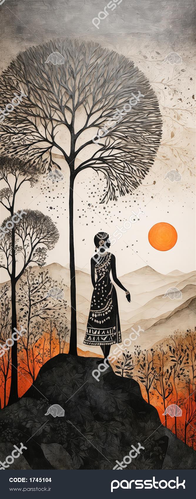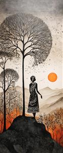 پرتره زن قبیله‌ای سیاه در حال تماشای غروب نارنجی از بالای صخره، طرح عمودی