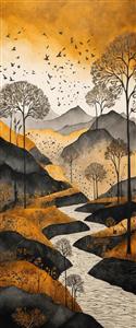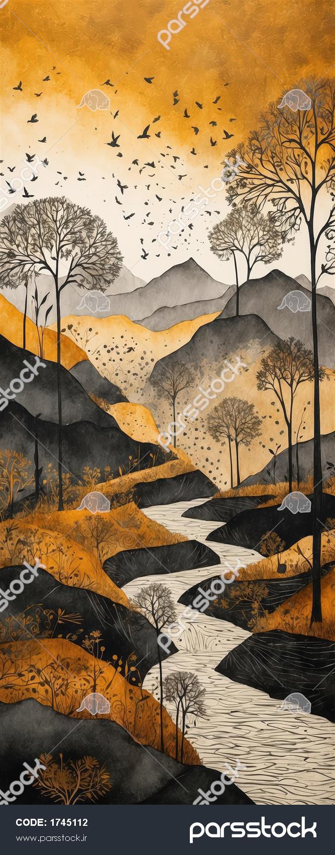 نقاشی منظره رودخانه پیچان در دره کوهستانی با طیف رنگی نارنجی و سیاه، طرح عمودی