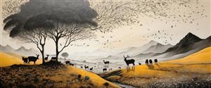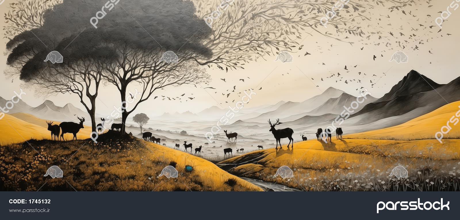 منظره نقاشی گله گوزنها در دشت طلایی با رودخانه و کوههای مهآلود، تابلو عریض نقاشی گله گوزنهای تیره در کوهستان و صخرههای سیاه و طلایی، تابلو عریض نقاشی گله گوزنها در کنار رودخانه زیر درخت بزرگ، طرح افقی با رنگهای سیاه و طلایی منظره گوزنها در دشت با درختان سیاه و طلایی و غروب آفتاب، تابلو عریض فاخر نقاشی گوزن سلطنتی (استگ) با طرحهای اسلیمی طلایی در طبیعت مهآلود، تابلو لوکس نقاشی گله گوزنها در فضای غار مانند با درختان و رودخانه، طرح فاخر عریض منظره نقاشی آبرنگی عمودی از رودخانه و کوهستان با غروب طلایی و گله گوزنها گروه گوزنها در کنار صخرهها و رودخانه در طبیعتی با رنگهای طلایی و سیاه، طرح دکوراتیو گله گوزنها زیر درخت بزرگ در کنار رودخانه، طرح هنری با فضای تیره و طلایی نقاشی مناظر کوهستانی با رودخانه و گله گوزنها و درختان پاییزی، طرح پانوراما مشاهده همه