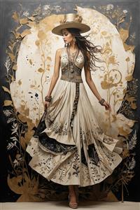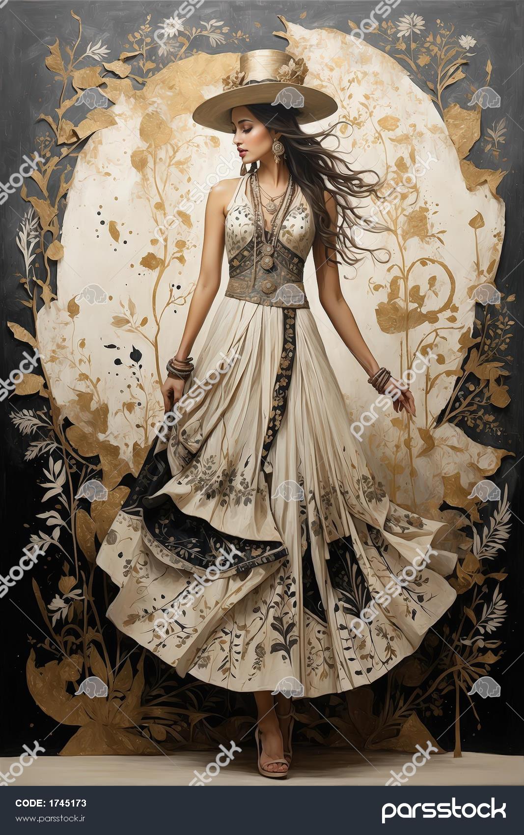 زن با لباس مجلسی طرح‌دار کرم و مشکی و کلاه حصیری در میان هاله‌ای از نقوش طلایی