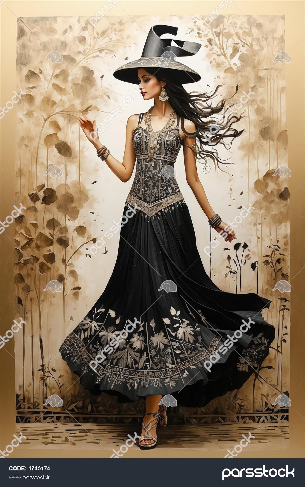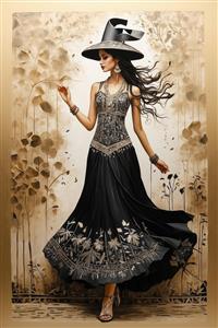 زن شیک با لباس مشکی مجلسی گلدوزی شده و کلاه فانتزی در باد روی پس‌زمینه طلایی