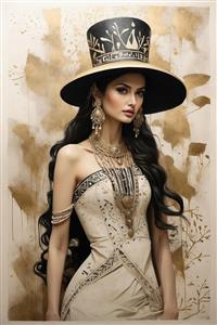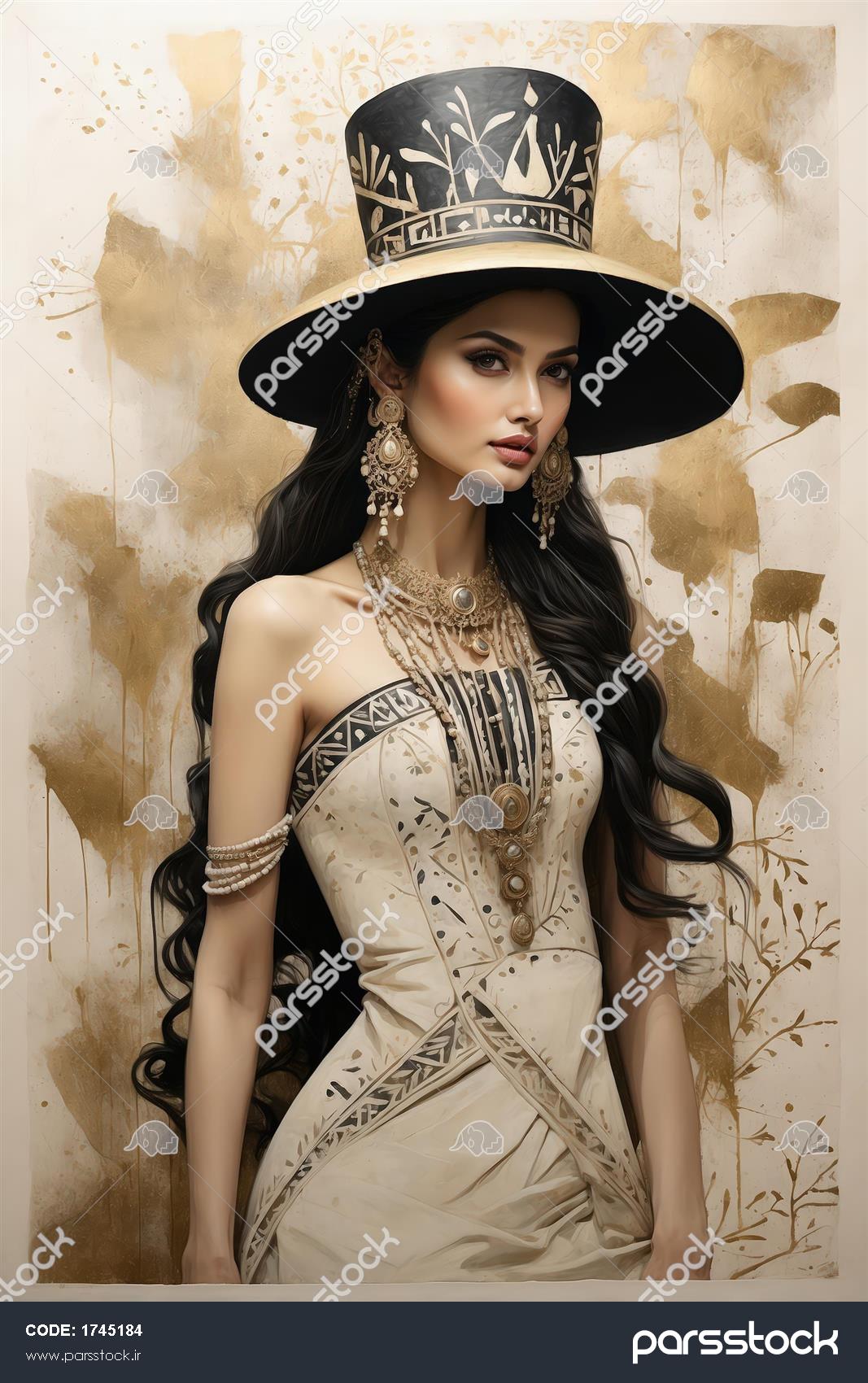 پرتره فاخر زن در کت کرستی طلایی با گلدوزی و دامن مجلل پرچین مدل زن با لباس بلند مجلسی کرم و طلایی و کلاه بزرگ، در دکوراسیون دیواری لوکس پرتره مدل زن با تاج سلطنتی و جواهرات طلایی، زمینه هنری گیاهی سیاه و طلایی تصویر تمامقد مدل زن با لباس فاخر مشکی و طلایی و کلاه لبه پهن، ژست دراماتیک مدل زن با کلاه و لباس شب مشکی طلایی با پارچه موجدار، عکس فشن لاکچری پرتره فشن کلاه طلایی زوج مجلل لباس طلایی پرتره نزدیک سیندرلا با تاج و گوشواره بزرگ آبی در قاب طلایی گلدار زن شیک با لباس مشکی مجلسی گلدوزی شده و کلاه فانتزی در باد روی پسزمینه طلایی تصویر فشن زنانه با لباس دنبالهدار مشکی و کرم و کلاه گشاد در زمینه آبرنگی طلایی و جذاب نمایش همه