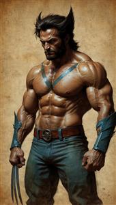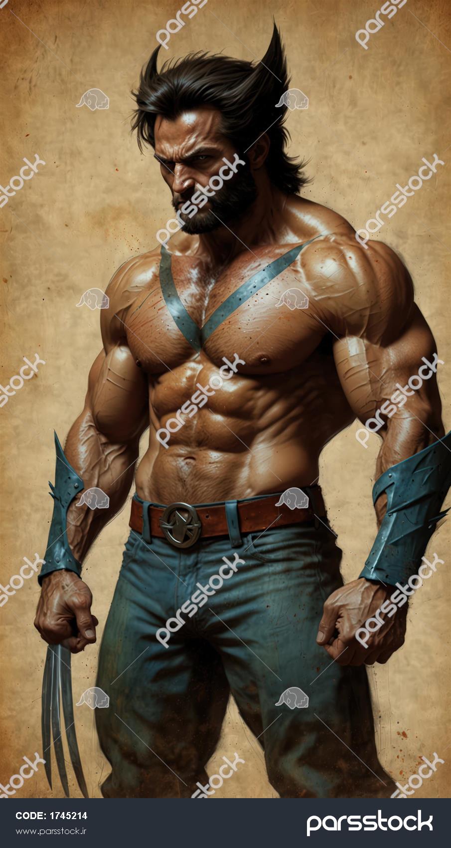طرح وولورین با نیم‌تنه برهنه و نشان فلزی آبی روی سینه و دستبندهای نظامی