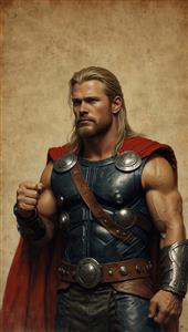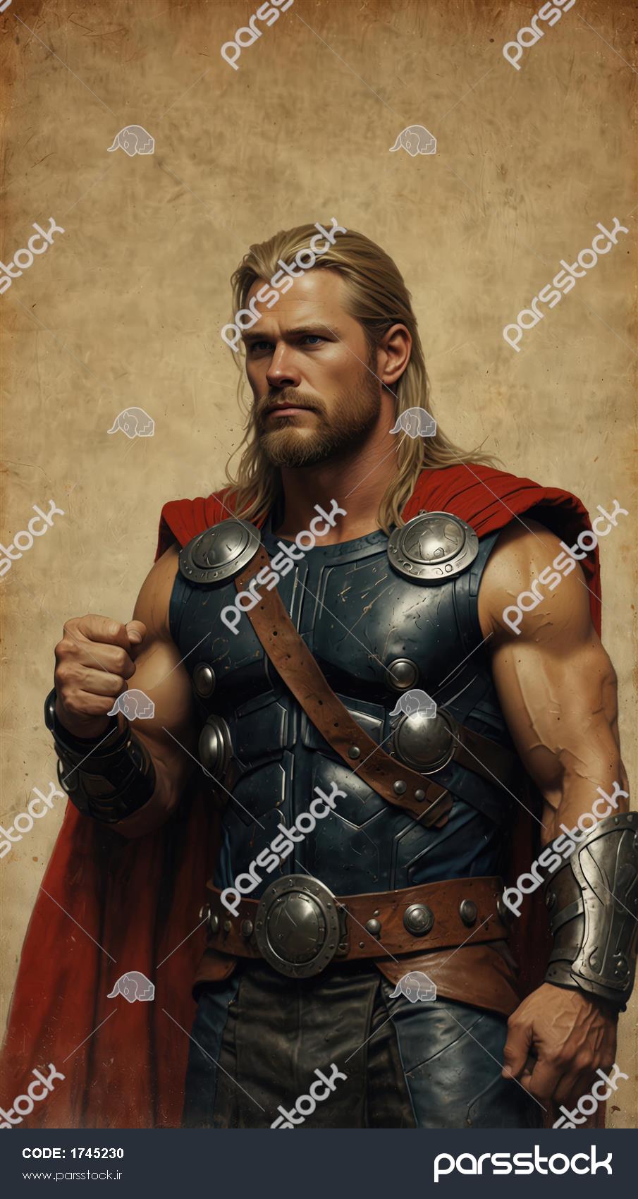 تصویر باکیفیت نیم‌تنه ثور با دست گره‌شده، پرتره قدرتمند در زره سنگی و شنل قرمز