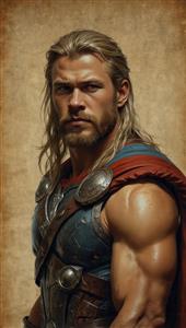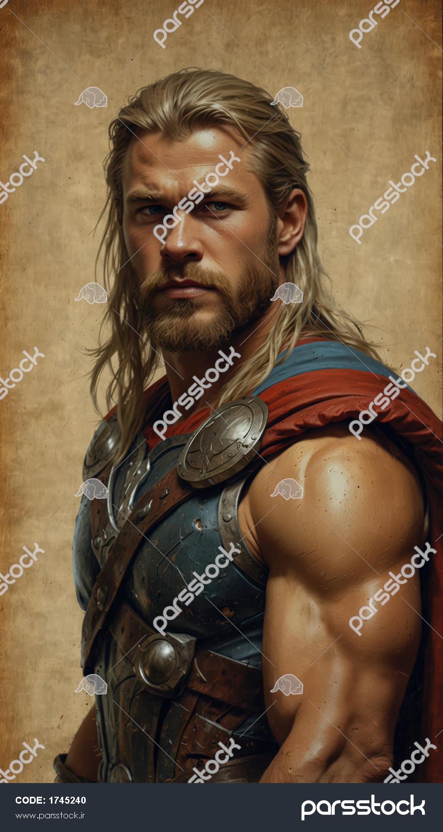 تصویر باکیفیت ثور با ژست سه‌رخ، پرتره عضلانی با شنل قرمز و پس‌زمینه بافت‌دار قدیمی