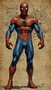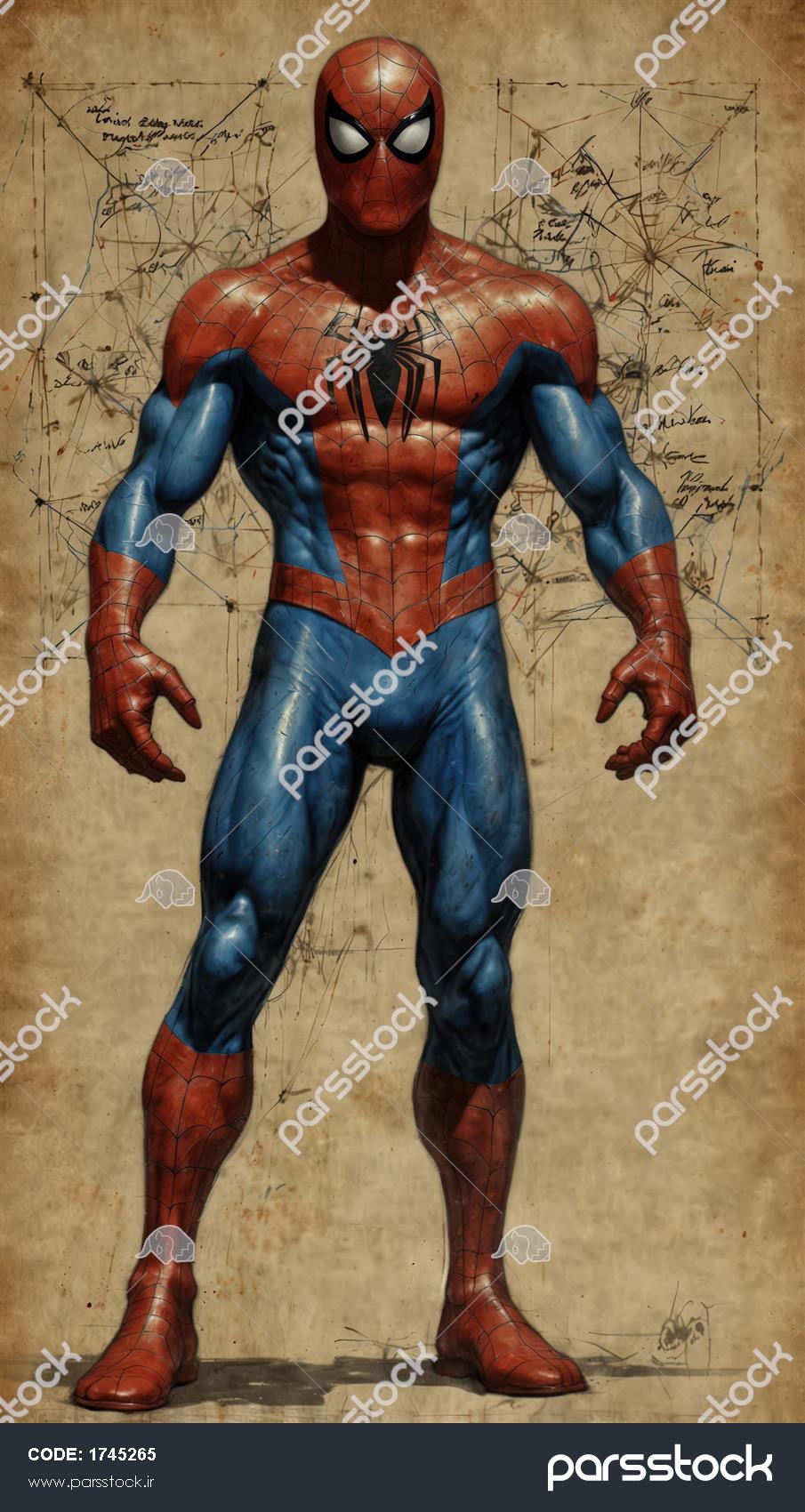 تصویر حرفه‌ای مرد عنکبوتی ایستاده، طراحی عضلانی با پس‌زمینه اسناد مهندسی و دست‌نوشته‌ها