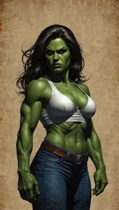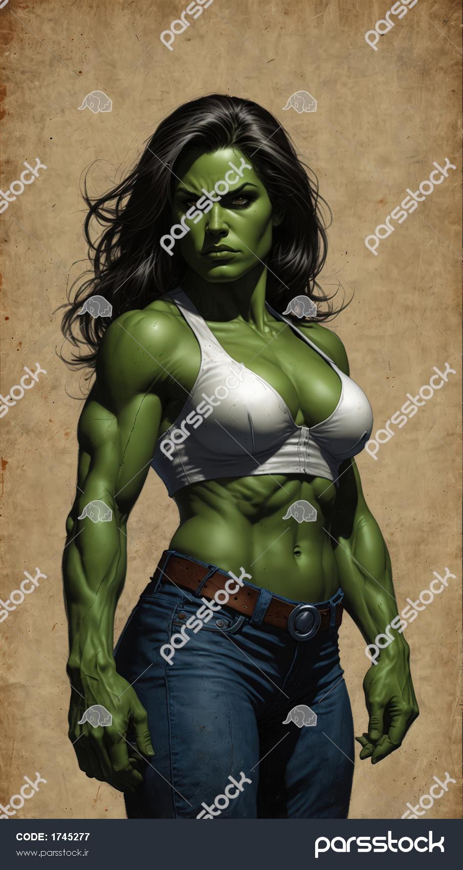 تصویر تمام قد شی هالک با شلوار جین و ژست جسورانه، مناسب چاپ‌های مدرن