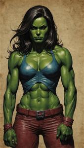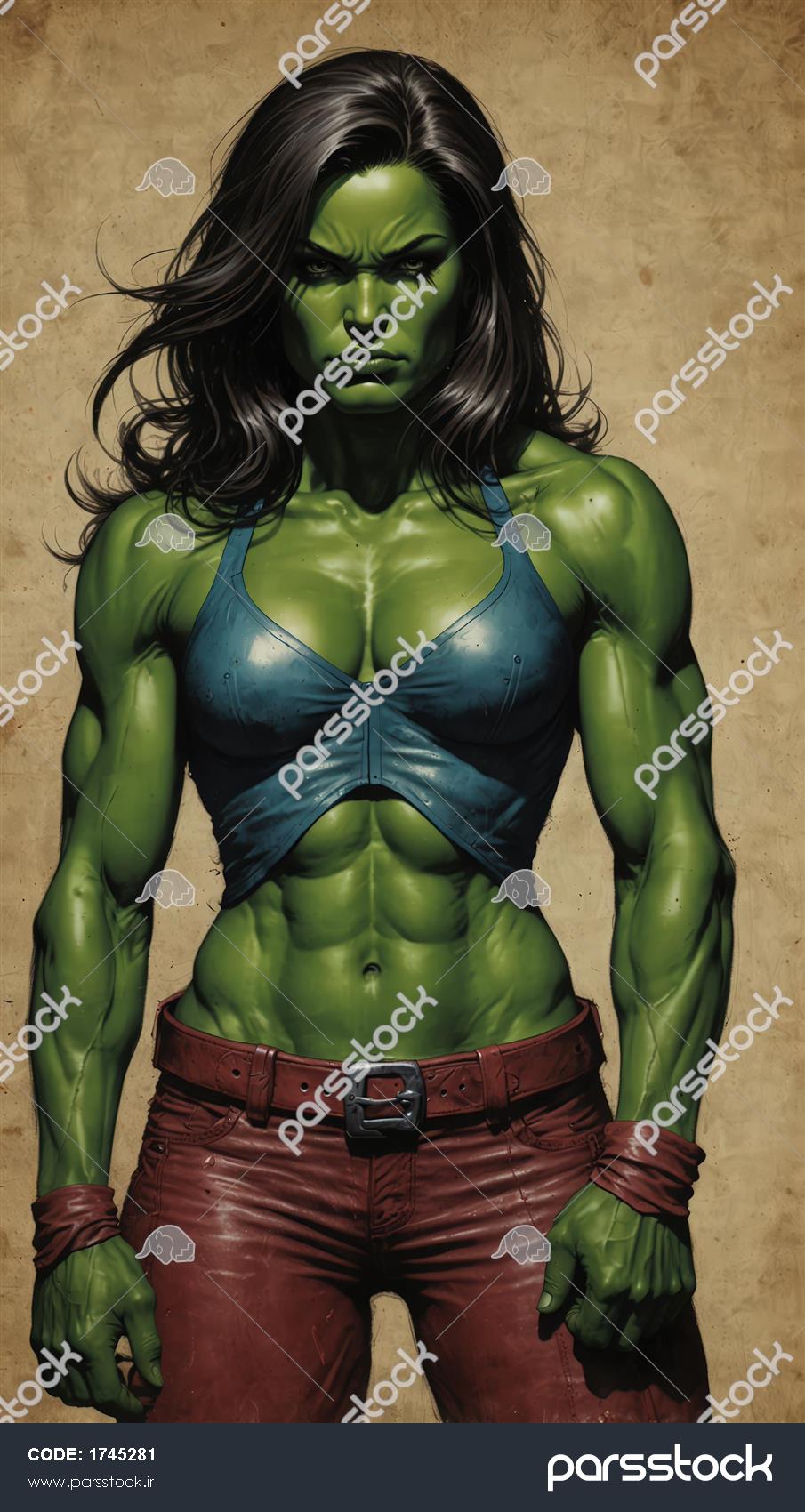 تصویر تمام قد شی هالک با لباس آبی و شلوار چرمی قرمز، مناسب چاپ‌های مدرن و عریض