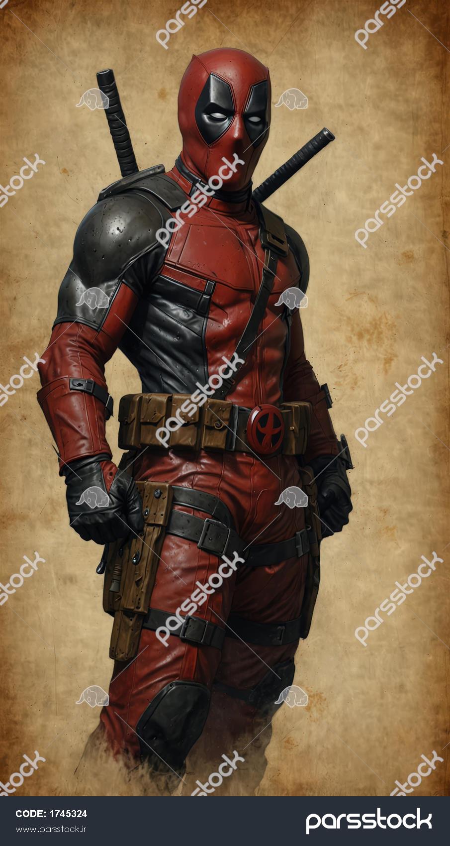 عکس ددپول با لباس رزمی و زره شانه در حالت نیم‌رخ استوار