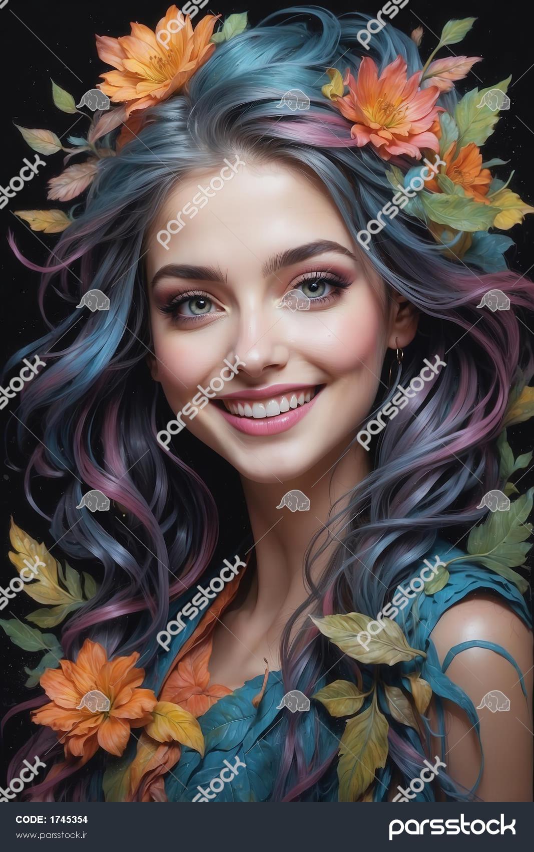پرتره دختر خندان با موهای رنگی و تاج گل‌های پاییزی، تم شاد و سرزنده، مناسب پوستر و دکوراسیون مدرن