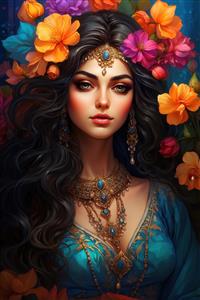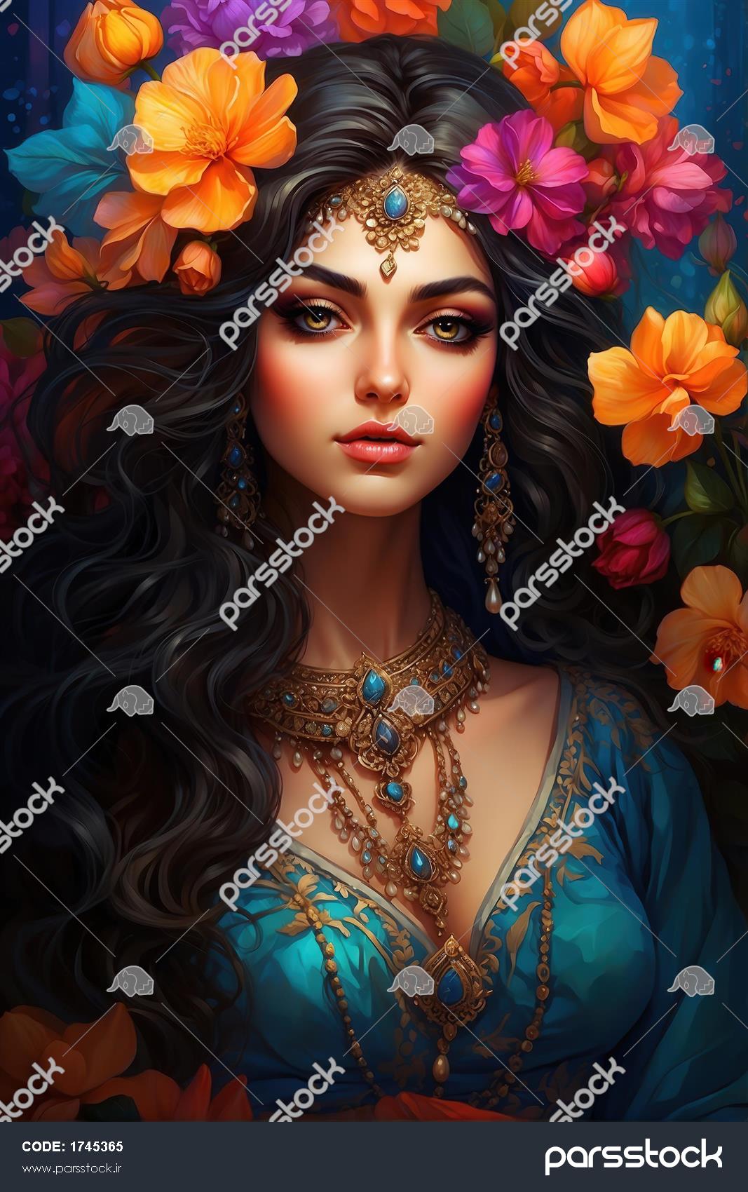 پرتره دختر با آرایش غلیظ و جواهرات بزرگ، لباس آبی سلطنتی و تاج گل پررنگ، کنتراست رنگی بالا برای چاپ‌های عریض