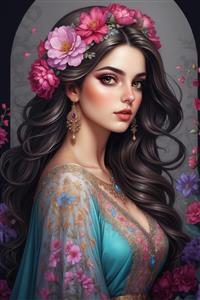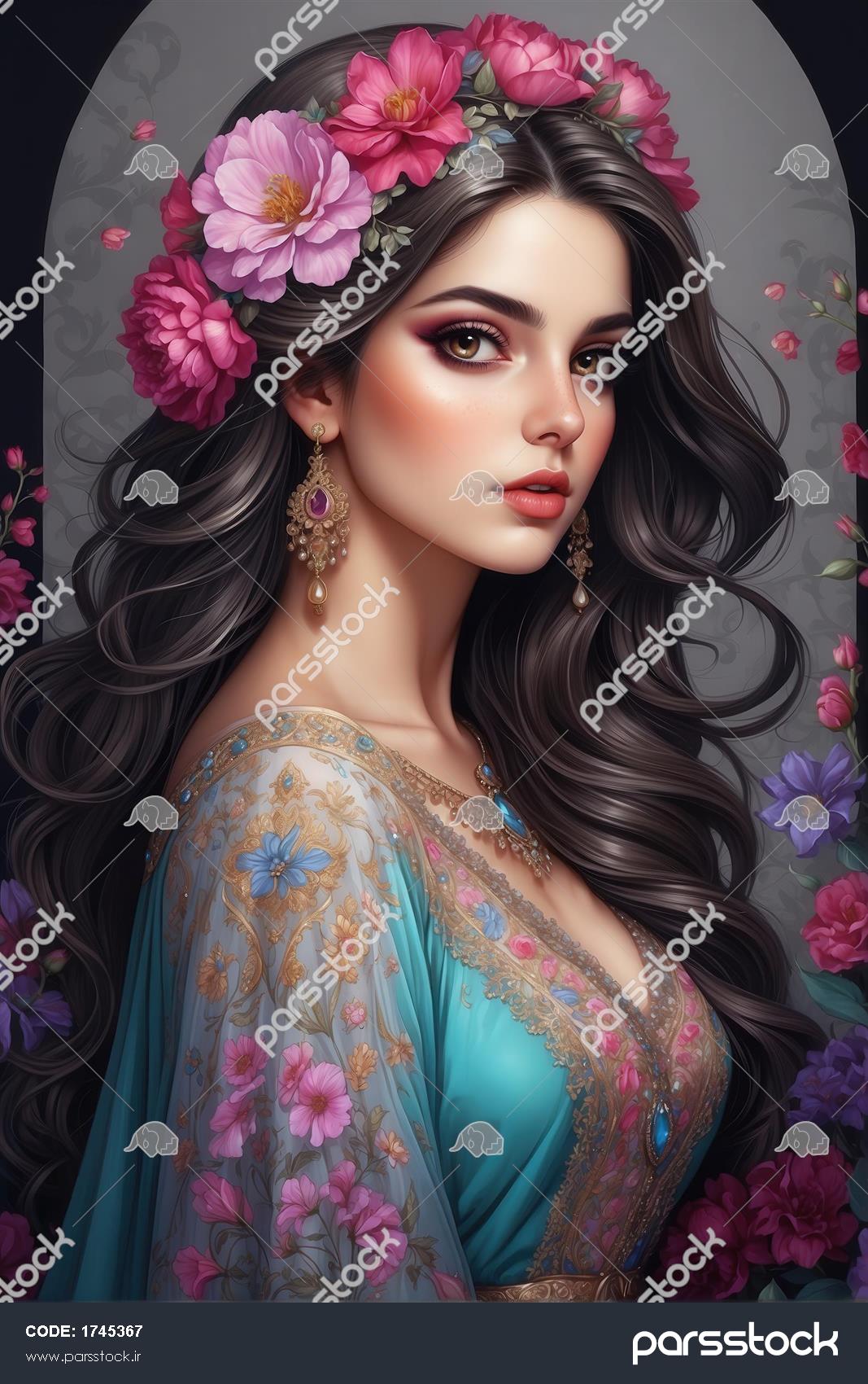 پرتره شاهزاده خانم با موهای مواج تیره و تاج گل و پروانه، لباس آبی طلایی مجلسی، نقاشی فانتزی با کیفیت عالی پرتره دختر با موهای تیره و تاج گل رز صورتی و نارنجی، لباس گلدوزی شده، تصویر فاخر و چشمنواز برای تابلو پرتره دختر شرقی با موهای مواج تیره، تاج گل و لباس آبی فیروزهای مجلسی، نقاشی دیجیتال سلطنتی برای تابلو پرتره دختر با موهای بلند تیره و تاج گل طبیعی، لباس آبی سنتی و جواهرات طلایی فیروزهای، مناسب دکوراسیون ایرانی پرتره دختر با موهای بلند و لباس آبی فیروزهای، گلدوزی طلایی و تاج گل نارنجی، تم کلاسیک شرقی برای چاپ بوم پرتره دختر شرقی با موهای تیره و لباس بنفش سلطنتی، جواهرات فیروزهای و تاج گل، مناسب چاپ تابلو و پوستر فاخر پرتره دختر در لباس آبی گلدوزی شده، با تاج گل یاسی و پسزمینه باغ و عمارت تاریخی، مناسب چاپهای دکوراتیو فاخر پرتره دختر با آرایش غلیظ و جواهرات بزرگ، لباس آبی سلطنتی و تاج گل پررنگ، کنتراست رنگی بالا برای چاپهای عریض پرتره زن با لباس و جواهرات هندی یا عربی، ملکه شرقی با تاج گل نارنجی و آبی پرتره دختر با لباس آبی مجلسی و گلدوزیهای طلایی، موهای تیره و امواج گل در پسزمینه، مناسب چاپهای عریض مشاهده همه