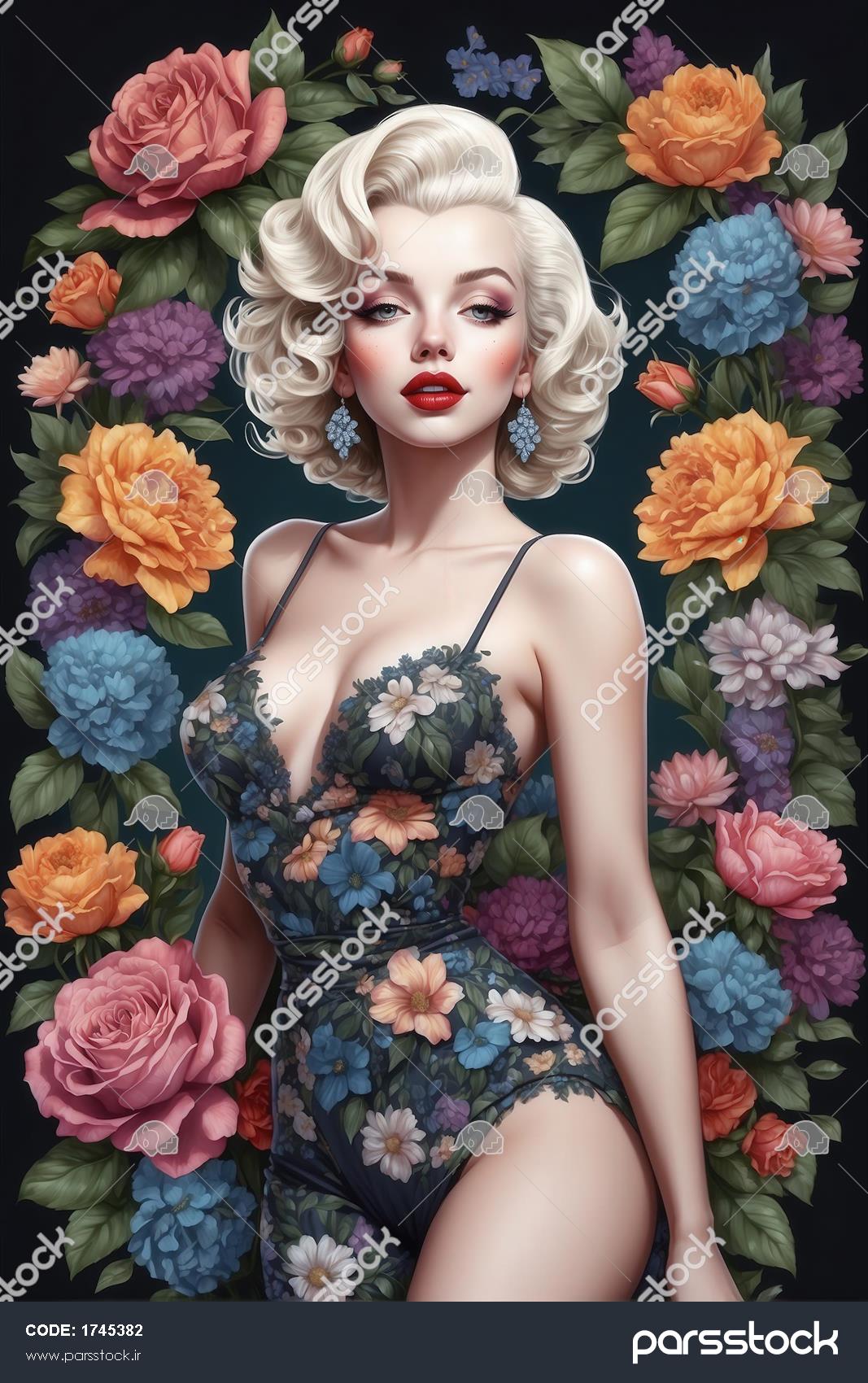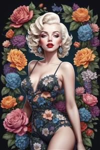 پرتره فانتزی مرلین مونرو در لباس گلدار بادی و پس‌زمینه انبوه گل‌های رز، مناسب دکوراسیون اتاق و سالن پذیرایی