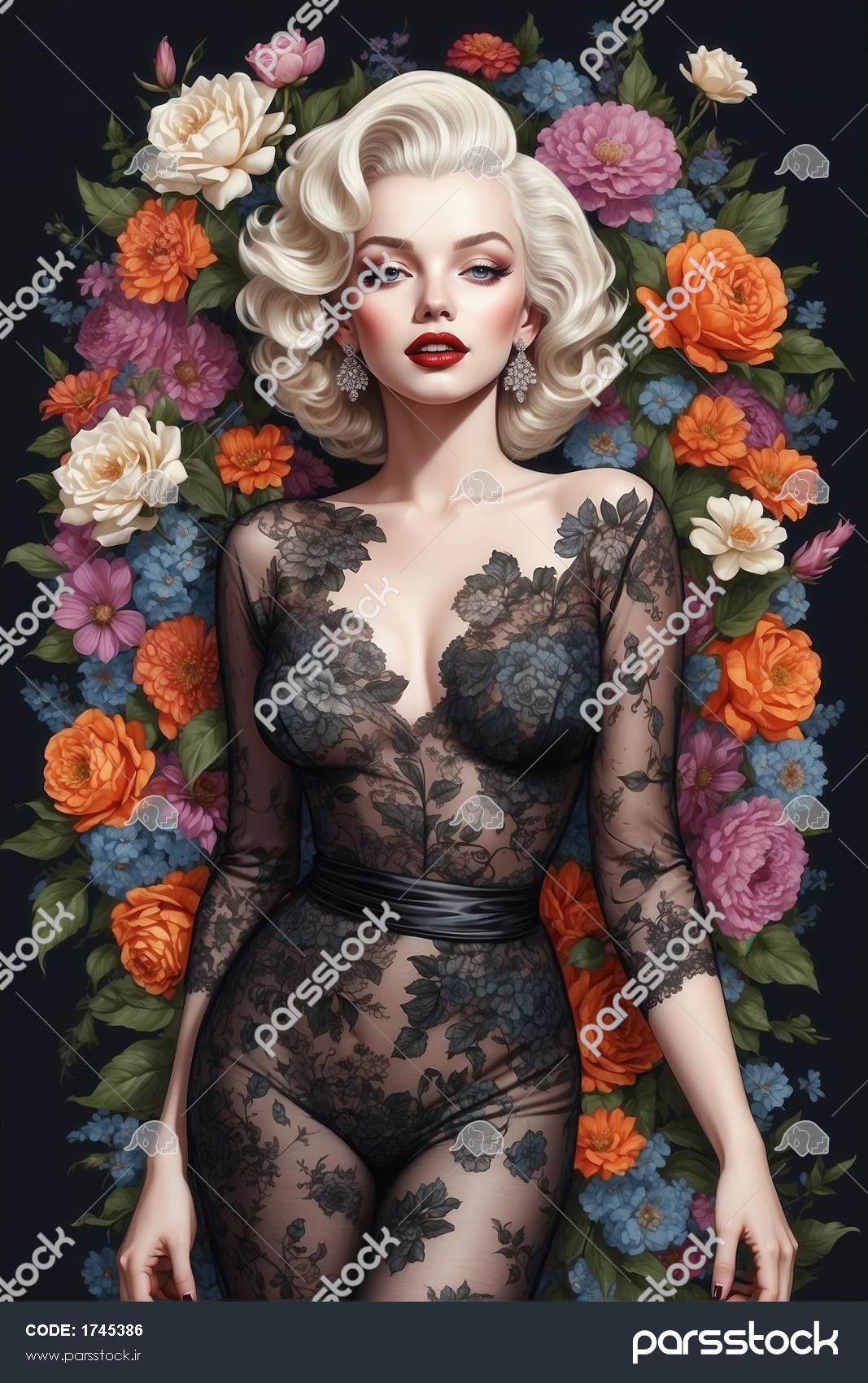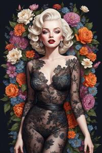 پرتره هنری مرلین مونرو در لباس بادی توری مشکی و گل‌های رنگارنگ، مناسب تابلوهای دکوراتیو با تم کلاسیک و مدرن