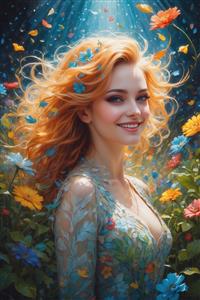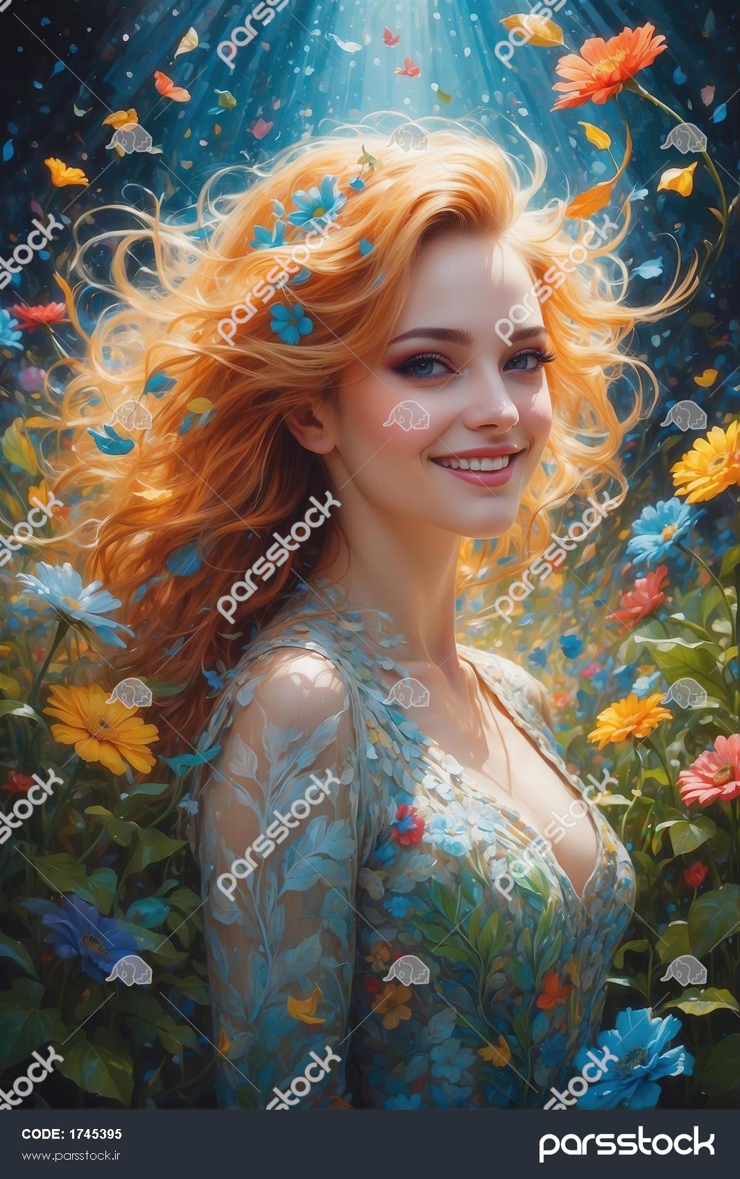 پرتره زن با موی روشن موج‌دار، لبخند شاد و گل‌های کوچک آبی در میان گل‌های رنگارنگ درخشان