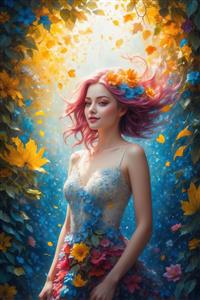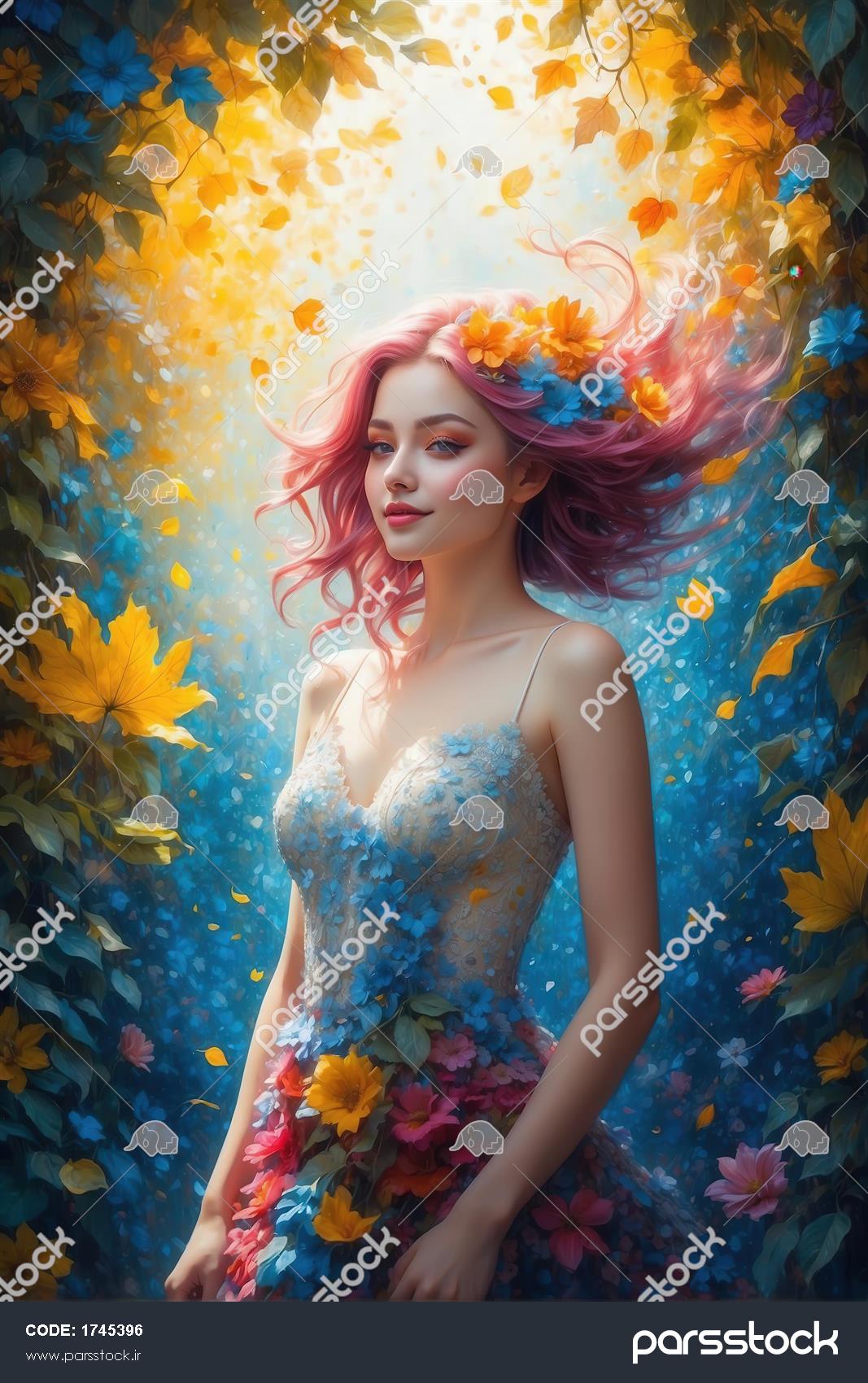 پرتره زن با موی صورتی آتشین و لباس مجلسی توری با گل‌های سه‌بعدی در میان برگ‌های پاییزی نارنجی