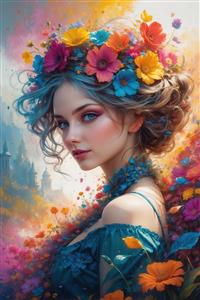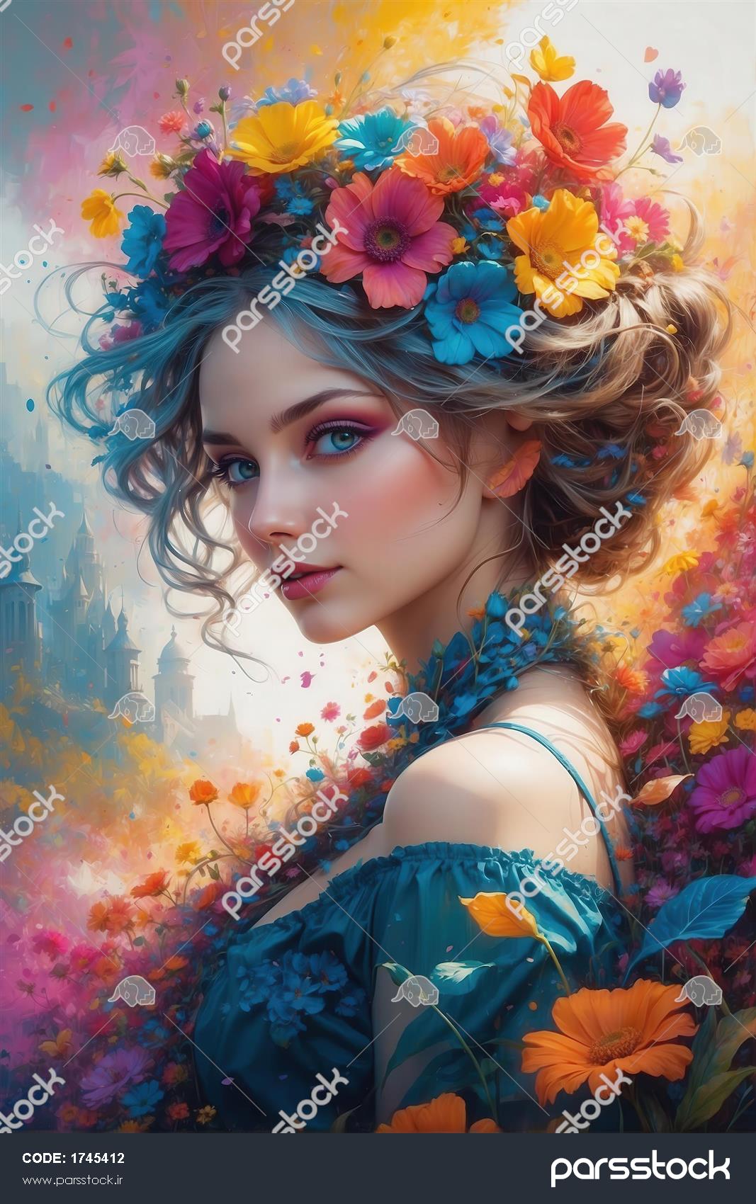 پرتره زن با موهای فرفری آبی و تاج گل‌های رنگارنگ در پس‌زمینه فانتزی قلعه و باغ گل برای چاپ فاخر