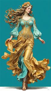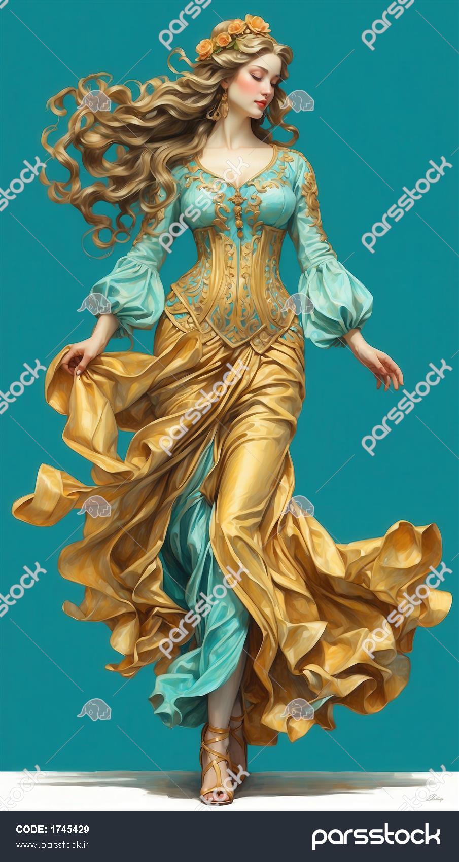 تصویر اورجینال زن با لباس پرچین مجلسی، کرست آبی گلدوزی شده و آستین پفی برای دکوراسیون لوکس و پوستر