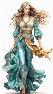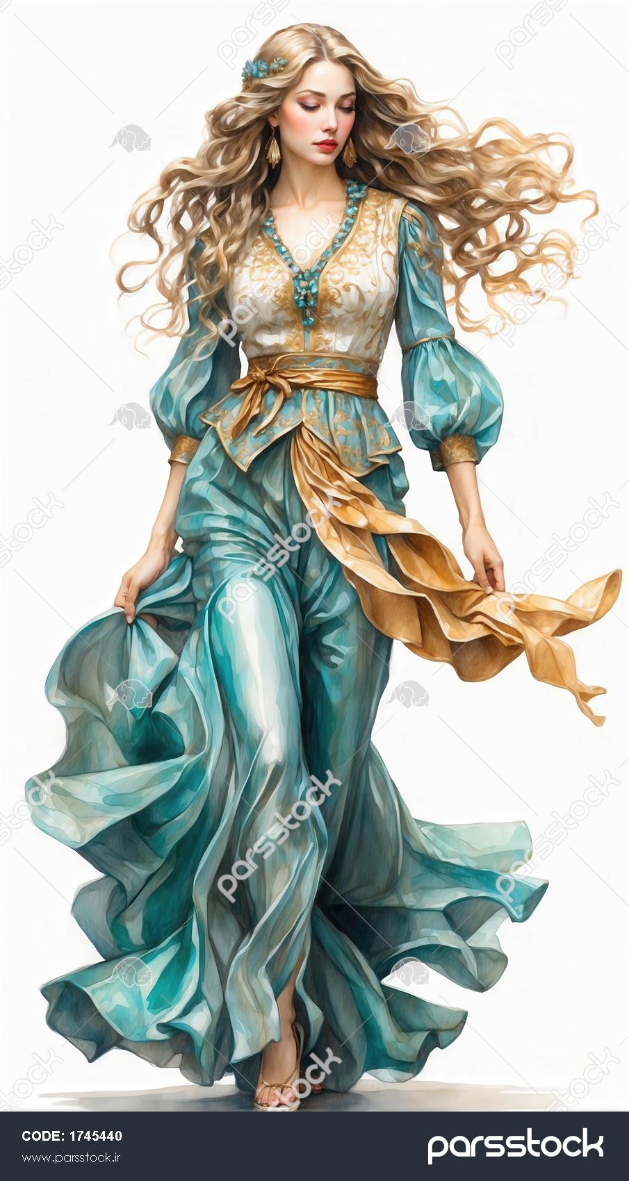 پرتره اورجینال زن با لباس آبی و سفید گشاد و دامن پرچین با رنگ‌های درخشان برای دکوراسیون لوکس و پوستر