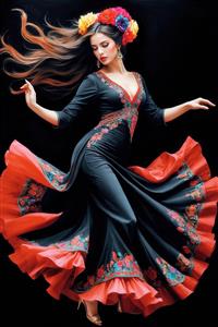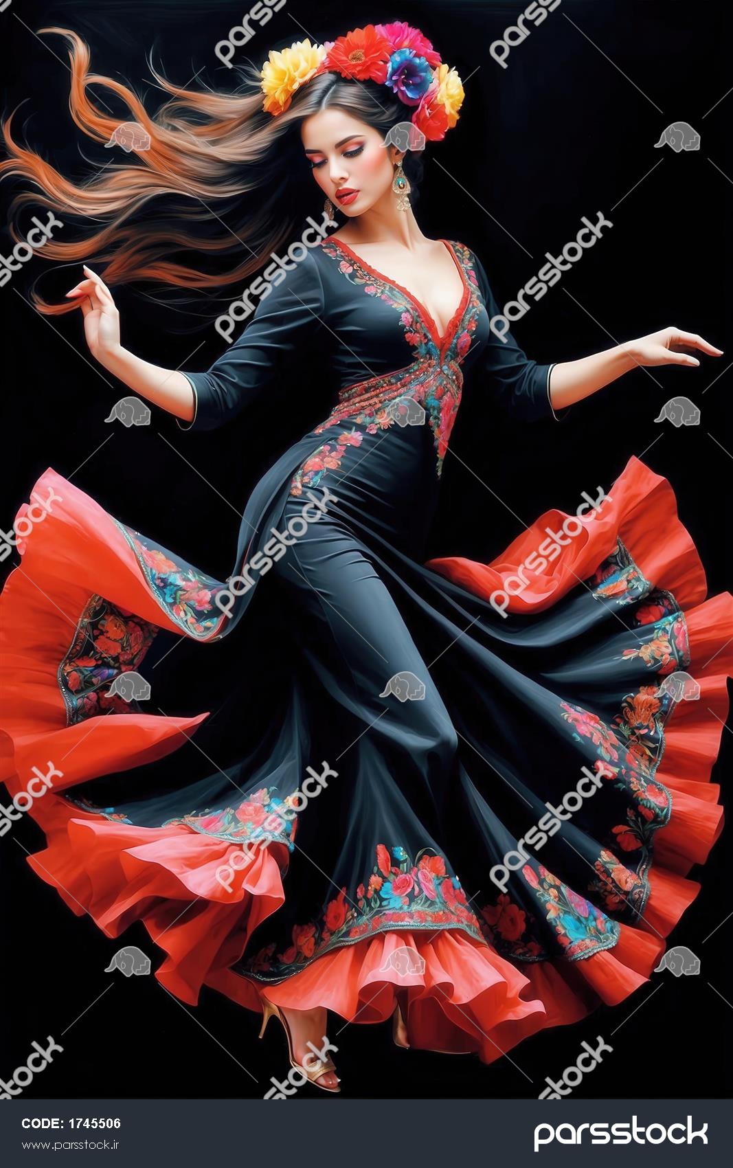 تصویر اورجینال رقصنده با گل‌های مکزیکی روی سر و لباس گلدوزی شده، چاپ تابلو مجلل